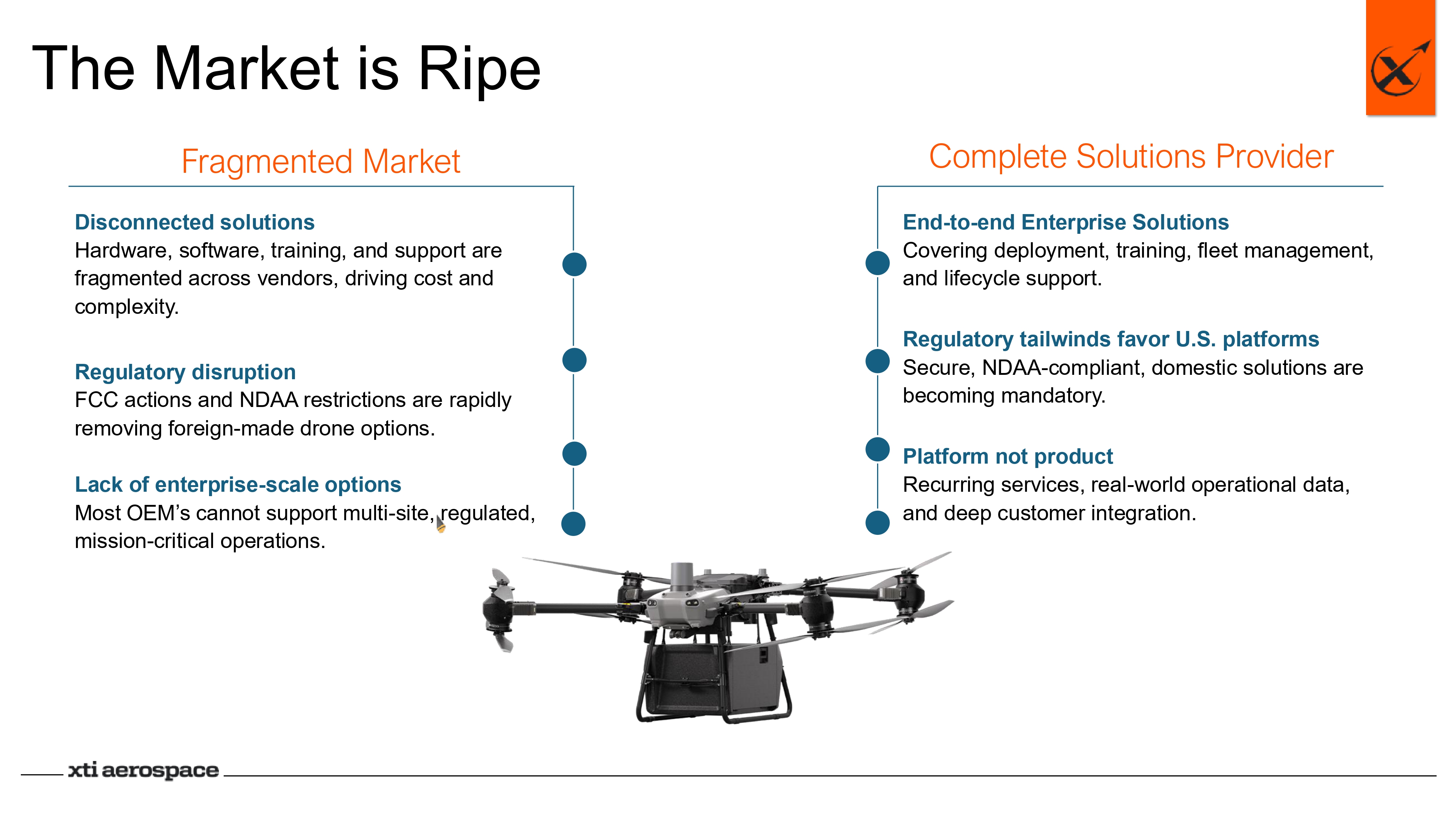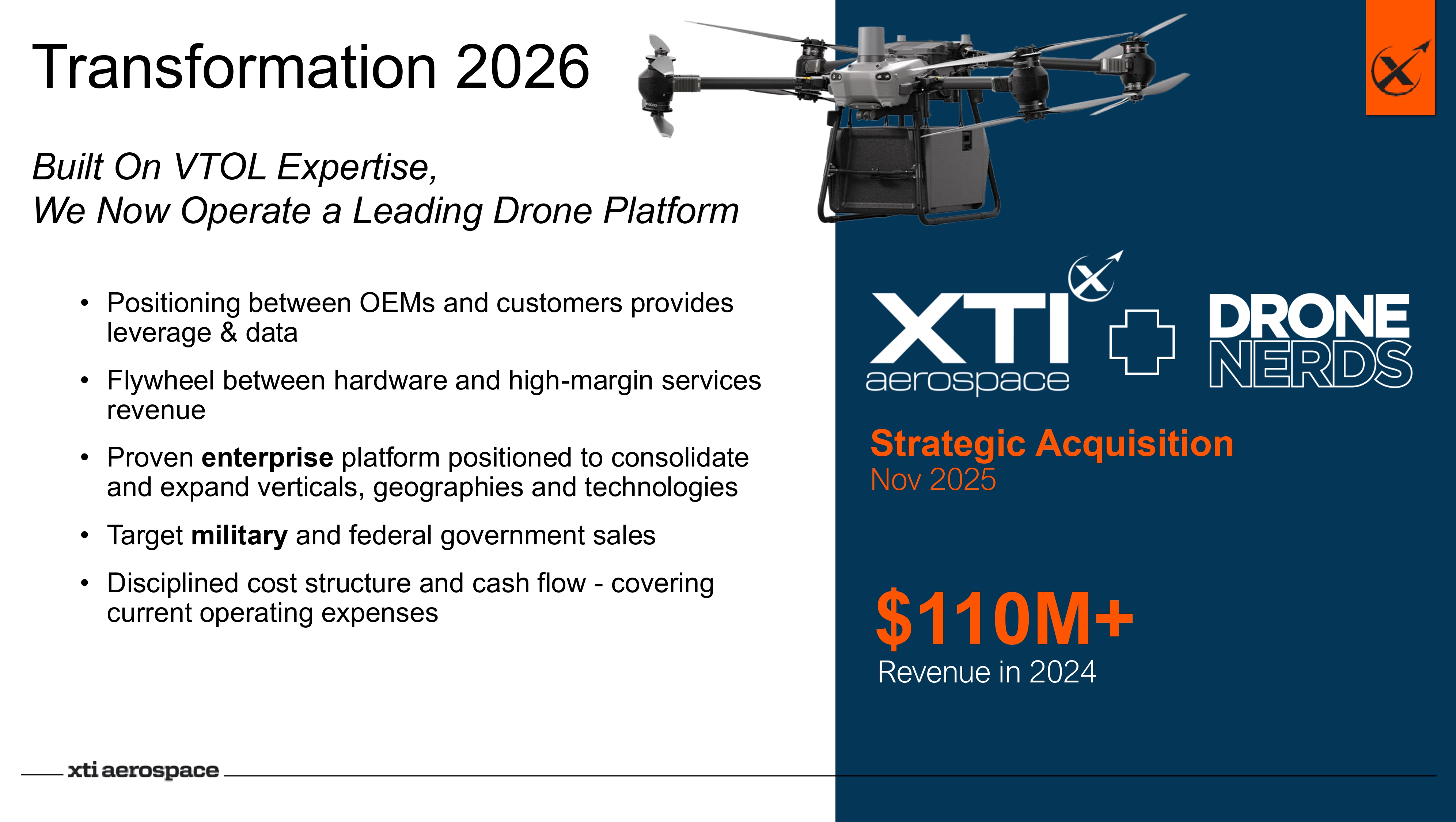 Disclaimer This presentation is made solely for information purposes and no representation or warranty, express or implied, is made by XTI Aerospace, Inc . (“XTI,” “we,” “us,” “our,” and, together with our subsidiaries, the “Company”) or any of its representatives as to the information contained in this presentation . This presentation contains forward - looking statements within the meaning of the Private Securities Litigation Reform Act of 1995 . All statements other than statements of historical facts contained in this presentation, including, without limitation, statements regarding future actions ; prospective products, anticipated expenses, applications, customers and technologies ; future performance or results of anticipated products ; and projected expenses and financial results, are forward - looking statements . You can find many (but not all) of these forward - looking statements by looking for words such as “approximates,” “believes,” “hopes,” “expects,” “anticipates,” “estimates,” “projects,” “intends,” “plans,” “would,” “should,” “could,” “may,” or other similar expressions in this presentation . These forward - looking statements are subject to certain risks and uncertainties that could cause actual results to differ materially from our historical experience and our present expectations or projections, including, without limitation : the Company’s history of losses ; our ability to achieve or maintain profitability in the future ; our limited operating history after our recent business combination with XTI Aircraft Company ; our ability to meet the development and commercialization schedule with respect to the TriFan 600 ; the risk that we have not yet manufactured any non - prototype aircraft or delivered any aircraft manufactured by us to a customer, and that we and our current and future collaborators may be unable to successfully develop and market our aircraft or solutions, or may experience significant delays in doing so ; the risk that we may not realize the expected benefits of the Drone Nerds acquisition ; unexpected costs, charges or expenses resulting from the Drone Nerds acquisition or any future acquisition or difficulties in integrating and operating acquired companies ; supplier concentration and regulatory actions affecting key suppliers ; changes in applicable laws or regulations ; evolving market demand ; the uncertainties associated with obtaining regulatory approvals of our aircraft including certification by the Federal Aviation Administration, which is a lengthy and costly process ; our ability to obtain adequate financing in the future as needed ; the risk that our conditional pre - orders for our aircraft (which include conditional aircraft purchase agreements, non - binding reservations, and options) are canceled, modified, delayed or not placed and that we must return refundable deposits ; emerging competition and rapidly advancing technology that may outpace our technology ; customer demand for the products and services we develop ; the impact of competitive or alternative products, technologies and pricing ; our ability to develop other new products and technologies ; our ability to navigate the regulatory environment and complexities with compliance related to such environment ; our ability to attract customers and/or fulfill customer orders ; our ability to enhance and maintain the reputation of our brand and expand our customer base ; our ability to scale in a cost - effective manner and maintain and expand our manufacturing and supply chain relationships ; general economic conditions and events and the impact they may have on us and our potential customers, including, but not limited to escalating tariff and non - tariff trade measures imposed by the U . S . and other countries, increases in inflation rates and rates of interest and supply chain challenges ; cybersecurity attacks ; our ability to maintain compliance with the continued listing requirements of the Nasdaq Capital Market ; lawsuits and other claims by third parties or investigations by various regulatory agencies that we may be subjected to and are required to report ; our ability to respond to a failure of our systems and technology to operate our business ; our ability to protect our intellectual property ; the outcome of any known and unknown litigation and regulatory proceedings ; our success at managing the risks involved in the foregoing items ; and other risks and uncertainties described in our public filings with the SEC, which are accessible at www . sec . gov , and which you are advised to consult . This presentation does not constitute an offer to sell, or the solicitation of an offer to buy, any securities, nor shall there be any sale of securities in any states or jurisdictions in which such offer, solicitation or sale would be unlawful . The forward - looking statements are based upon management’s beliefs and assumptions and are made as of the date of this presentation . We undertake no obligation to publicly update or revise any forward - looking statements included in this presentation . You should not place undue reliance on these forward - looking statements . This presentation also contains estimates, projections and other information concerning our industry and our business, including data regarding the estimated size of our markets and their projected growth rates . Unless otherwise indicated, such estimates, projections and other information is based on information released by independent industry analysts and other third - party sources and management estimates . In some cases, we do not expressly refer to the sources from which these data are derived . Management estimates are derived from publicly available information released by independent industry analysts and other third - party sources, as well as data from our internal research, and are based on assumptions made by us upo