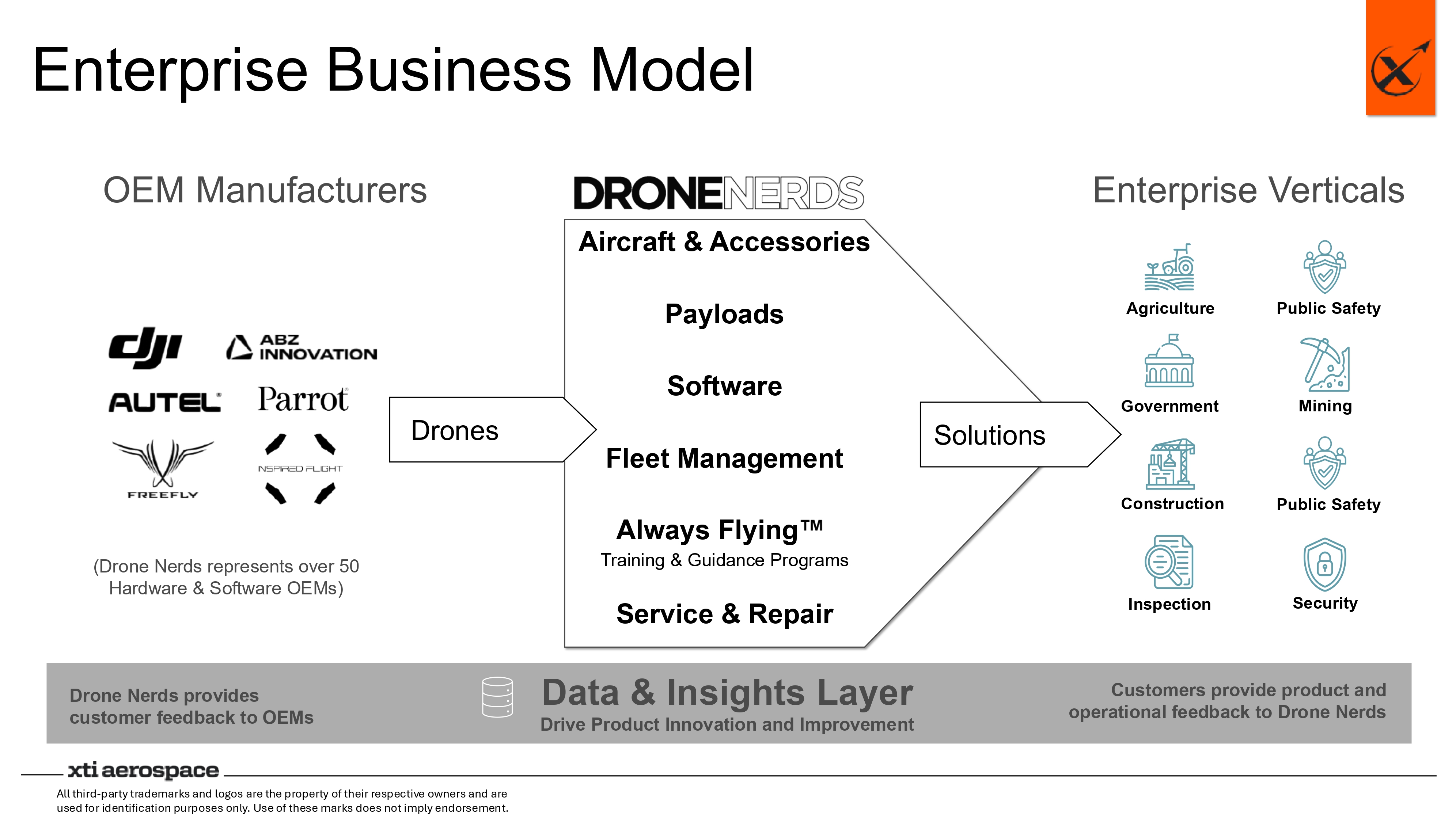 Enterprise Verticals Public Safety Agriculture Inspection Construction Security Mining Government Public Safety Data & Insights Layer Drive Product Innovation and Improvement Drone Nerds provides customer feedback to OEMs Customers provide product and operational feedback to Drone Nerds OEM Manufacturers (Drone Nerds represents over 50 Hardware & Software OEMs) Aircraft & Accessories Payloads Software Fleet Management Always Flying Training & Guidance Programs Service & Repair Solutions Enterprise Business Model All third - party trademarks and logos are the property of their respective owners and are used for identification purposes only. Use of these marks does not imply endorsement. Drones