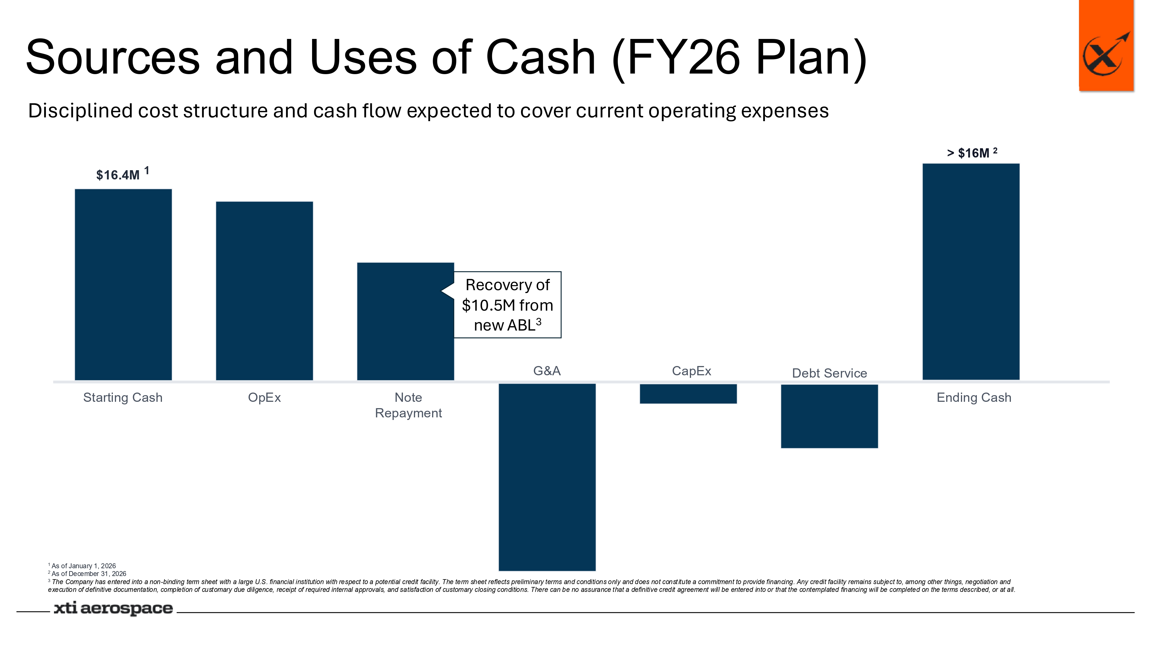 Starting Cash $ 16.4 M 1 OpEx G&A CapEx Debt Service Ending Cash Note Repayment Recovery of $10.5M from new ABL 3 Sources and Uses of Cash (FY26 Plan) Disciplined cost structure and cash flow expected to cover current operating expenses 1 As of January 1, 2026 2 As of December 31, 2026 3 The Company has entered into a non - binding term sheet with a large U.S. financial institution with respect to a potential credit facility. The term sheet reflects preliminary terms and conditions only and does not const it ute a commitment to provide financing. Any credit facility remains subject to, among other things, negotiation and execution of definitive documentation, completion of customary due diligence, receipt of required internal approvals, and sat isf action of customary closing conditions. There can be no assurance that a definitive credit agreement will be entered into or tha t the contemplated financing will be completed on the terms described, or at all. > $16M 2