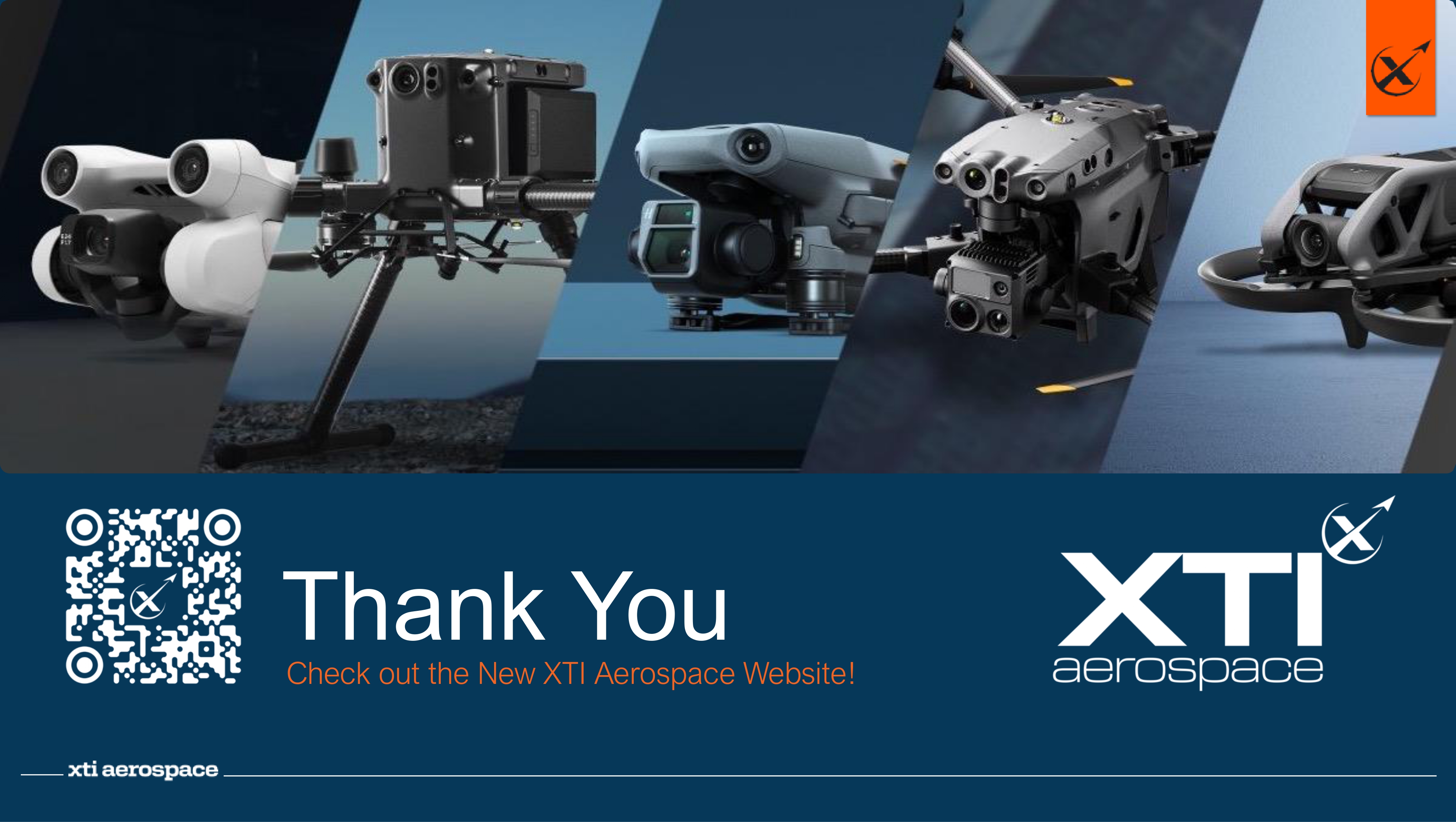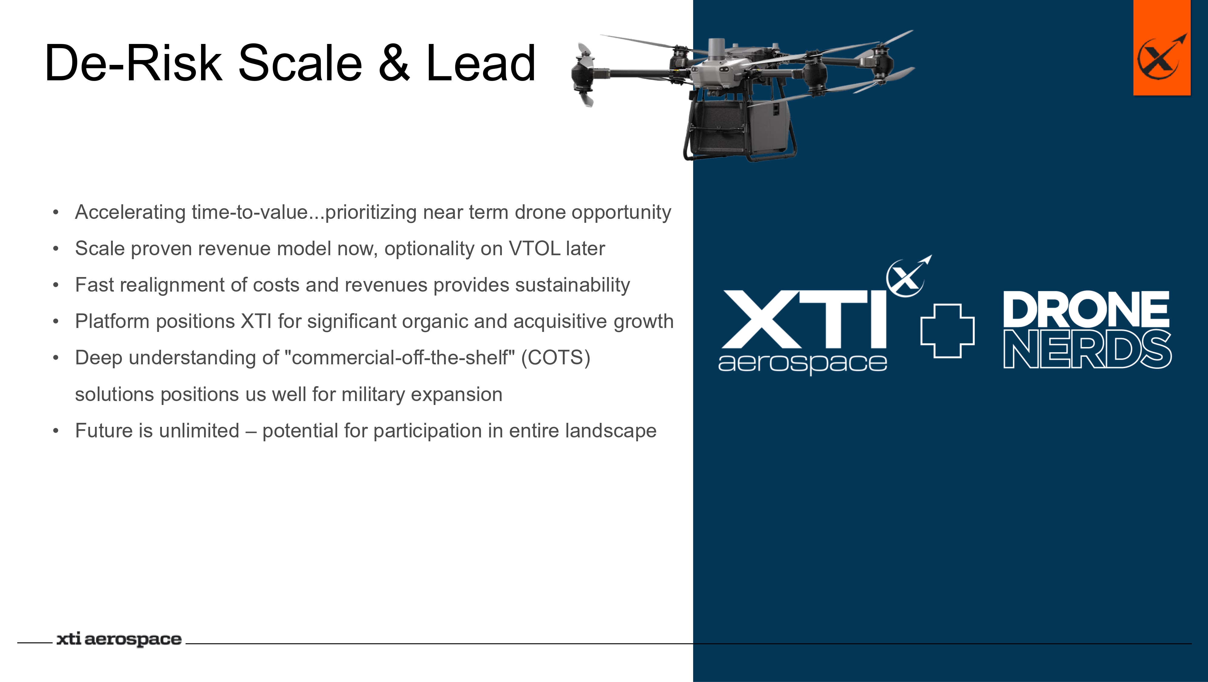 • Accelerating time - to - value...prioritizing near term drone opportunity • Scale proven revenue model now, optionality on VTOL later • Fast realignment of costs and revenues provides sustainability • Platform positions XTI for significant organic and acquisitive growth • Deep understanding of "commercial - off - the - shelf" (COTS) solutions positions us well for military expansion • Future is unlimited – potential for participation in entire landscape De - Risk Scale & Lead