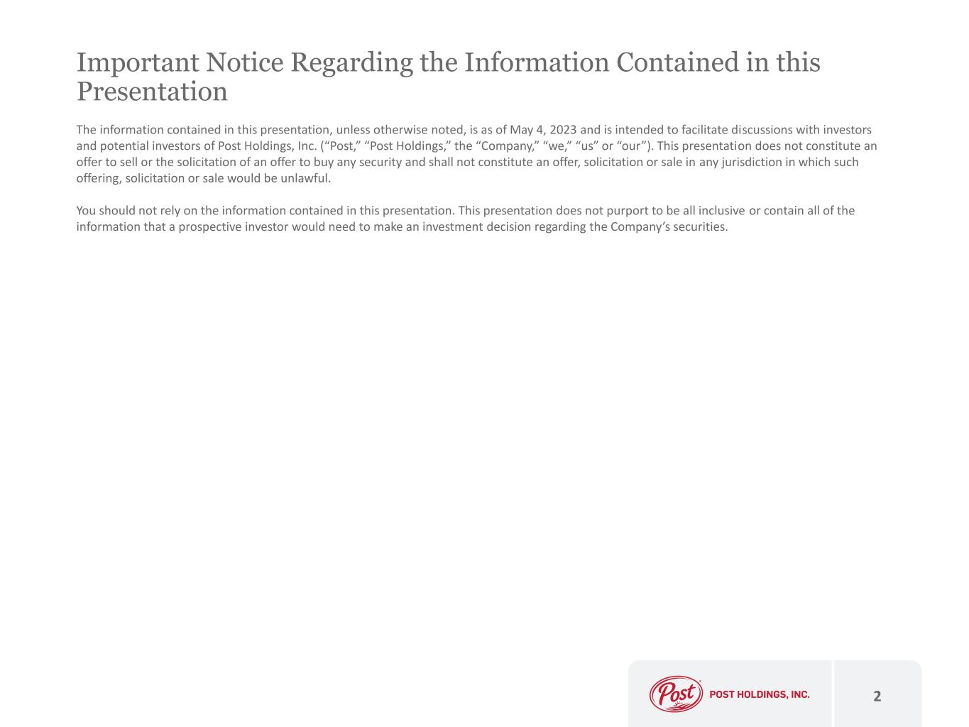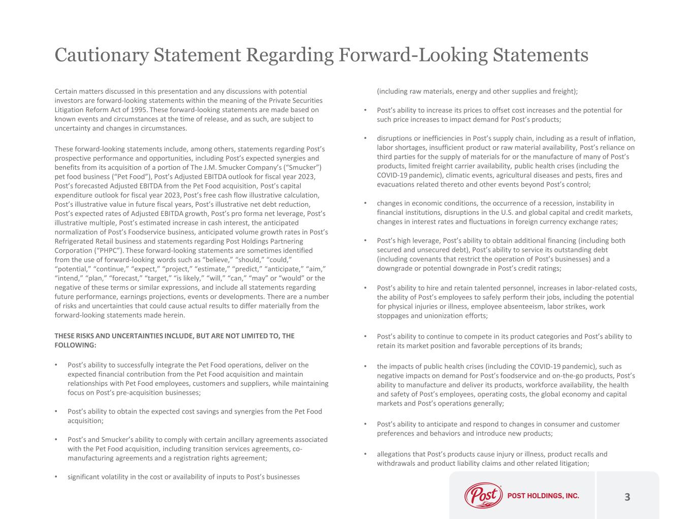Important Notice Regarding the Information Contained in this Presentation The information contained in this presentation, unless otherwise noted, is as of May 4, 2023 and is intended to facilitate discussions with investors and potential investors of Post Holdings, Inc. (“Post,” “Post Holdings,” the “Company,” “we,” “us” or “our”). This presentation does not constitute an offer to sell or the solicitation of an offer to buy any security and shall not constitute an offer, solicitation or sale in any jurisdiction in which such offering, solicitation or sale would be unlawful. You should not rely on the information contained in this presentation. This presentation does not purport to be all inclusive or contain all of the information that a prospective investor would need to make an investment decision regarding the Company’s securities. 2