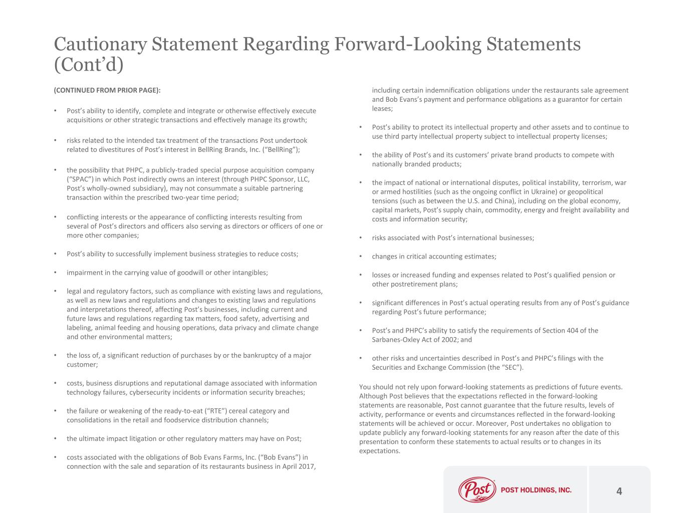 Cautionary Statement Regarding Forward-Looking Statements Certain matters discussed in this presentation and any discussions with potential investors are forward-looking statements within the meaning of the Private Securities Litigation Reform Act of 1995. These forward-looking statements are made based on known events and circumstances at the time of release, and as such, are subject to uncertainty and changes in circumstances. These forward-looking statements include, among others, statements regarding Post’s prospective performance and opportunities, including Post’s expected synergies and benefits from its acquisition of a portion of The J.M. Smucker Company’s (“Smucker”) pet food business (“Pet Food”), Post’s Adjusted EBITDA outlook for fiscal year 2023, Post’s forecasted Adjusted EBITDA from the Pet Food acquisition, Post’s capital expenditure outlook for fiscal year 2023, Post’s free cash flow illustrative calculation, Post’s illustrative value in future fiscal years, Post’s illustrative net debt reduction, Post’s expected rates of Adjusted EBITDA growth, Post’s pro forma net leverage, Post’s illustrative multiple, Post’s estimated increase in cash interest, the anticipated normalization of Post’s Foodservice business, anticipated volume growth rates in Post’s Refrigerated Retail business and statements regarding Post Holdings Partnering Corporation (“PHPC”). These forward-looking statements are sometimes identified from the use of forward-looking words such as “believe,” “should,” “could,” “potential,” “continue,” “expect,” “project,” “estimate,” “predict,” “anticipate,” “aim,” “intend,” “plan,” “forecast,” “target,” “is likely,” “will,” “can,” “may” or “would” or the negative of these terms or similar expressions, and include all statements regarding future performance, earnings projections, events or developments. There are a number of risks and uncertainties that could cause actual results to differ materially from the forward-looking statements made herein. THESE RISKS AND UNCERTAINTIES INCLUDE, BUT ARE NOT LIMITED TO, THE FOLLOWING: • Post’s ability to successfully integrate the Pet Food operations, deliver on the expected financial contribution from the Pet Food acquisition and maintain relationships with Pet Food employees, customers and suppliers, while maintaining focus on Post’s pre-acquisition businesses; • Post’s ability to obtain the expected cost savings and synergies from the Pet Food acquisition; • Post’s and Smucker’s ability to comply with certain ancillary agreements associated with the Pet Food acquisition, including transition services agreements, co- manufacturing agreements and a registration rights agreement; • significant volatility in the cost or availability of inputs to Post’s businesses (including raw materials, energy and other supplies and freight); • Post’s ability to increase its prices to offset cost increases and the potential for such price increases to impact demand for Post’s products; • disruptions or inefficiencies in Post’s supply chain, including as a result of inflation, labor shortages, insufficient product or raw material availability, Post’s reliance on third parties for the supply of materials for or the manufacture of many of Post’s products, limited freight carrier availability, public health crises (including the COVID-19 pandemic), climatic events, agricultural diseases and pests, fires and evacuations related thereto and other events beyond Post’s control; • changes in economic conditions, the occurrence of a recession, instability in financial institutions, disruptions in the U.S. and global capital and credit markets, changes in interest rates and fluctuations in foreign currency exchange rates; • Post’s high leverage, Post’s ability to obtain additional financing (including both secured and unsecured debt), Post’s ability to service its outstanding debt (including covenants that restrict the operation of Post’s businesses) and a downgrade or potential downgrade in Post’s credit ratings; • Post’s ability to hire and retain talented personnel, increases in labor-related costs, the ability of Post’s employees to safely perform their jobs, including the potential for physical injuries or illness, employee absenteeism, labor strikes, work stoppages and unionization efforts; • Post’s ability to continue to compete in its product categories and Post’s ability to retain its market position and favorable perceptions of its brands; • the impacts of public health crises (including the COVID-19 pandemic), such as negative impacts on demand for Post’s foodservice and on-the-go products, Post’s ability to manufacture and deliver its products, workforce availability, the health and safety of Post’s employees, operating costs, the global economy and capital markets and Post’s operations generally; • Post’s ability to anticipate and respond to changes in consumer and customer preferences and behaviors and introduce new products; • allegations that Post’s products cause injury or illness, product recalls and withdrawals and product liability claims and other related litigation; 3
