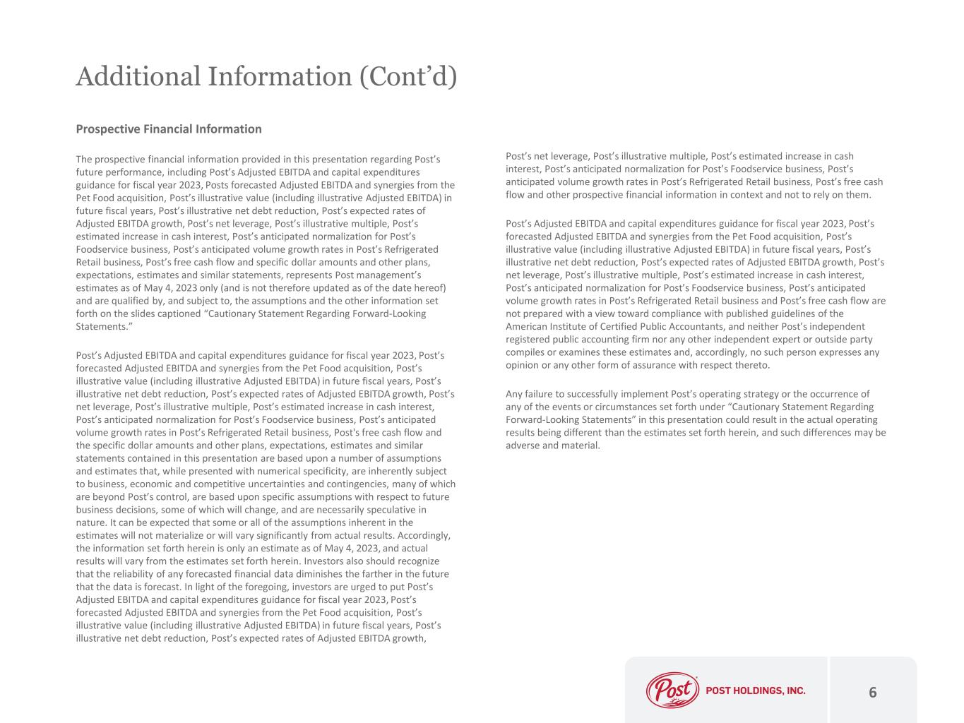 Additional Information Non-GAAP Financial Measures Post uses Adjusted EBITDA, free cash flow, net leverage and Post’s illustrative multiple, all of which are non-GAAP measures, in this presentation to supplement financial measures prepared in accordance with U.S. generally accepted accounting principles (“GAAP”). Adjusted EBITDA is a non-GAAP measure which represents earnings before interest, income taxes, depreciation, amortization and other adjustments. Free cash flow is a non-GAAP measure which represents cash flow from operating activities less capital expenditures. Net leverage is a non-GAAP measure which represents net debt divided by Adjusted EBITDA. Post’s illustrative multiple is a non-GAAP measure which represents enterprise value divided by Adjusted EBITDA. Adjusted EBITDA, free cash flow, net leverage and Post’s illustrative multiple are not prepared in accordance with GAAP and may not be comparable to similarly-titled measures of other companies. Management uses certain non-GAAP measures, including Adjusted EBITDA, as a key metric in the evaluation of underlying company and segment performance, in making financial, operating and planning decisions, and, in part, in the determination of bonuses for executive officers and employees. Additionally, Post is required to comply with certain covenants and limitations that are based on variations of EBITDA in its financing documents. Management believes the use of non-GAAP measures, including Adjusted EBITDA, provides increased transparency and assists investors in understanding the underlying operating performance of Post and Post’s segments and in the analysis of ongoing operating trends. Post considers Adjusted EBITDA an important supplemental measure of performance and ability to service debt. Adjusted EBITDA is often used to assess performance because it allows comparison of operating performance on a consistent basis across periods by removing the effects of various items. Post considers free cash flow an important supplemental measure of ability to service debt and repurchase shares. Post considers net leverage an important measure of ability to service debt. Post considers its illustrative multiple an important measure to compare its valuation to its peers. Adjusted EBITDA, free cash flow, net leverage and illustrative multiples have various limitations as analytical tools, and you should not consider them in isolation or as substitutes for analysis of results as reported under GAAP. In this presentation, Post provides its Adjusted EBITDA guidance for fiscal year 2023, its expectations as to the Adjusted EBITDA from the Pet Food acquisition and its illustrative Adjusted EBITDA in future fiscal years and discloses its free cash flow, net leverage and illustrative multiple only on a non-GAAP basis. Post does not provide a reconciliation of Post’s forward-looking Adjusted EBITDA, free cash flow, net leverage and Post’s illustrative multiple non-GAAP measures to the most directly comparable GAAP measures due to the inherent difficulty in forecasting and quantifying certain amounts that are necessary for such reconciliation, including adjustments that could be made for income/expense on swaps, net, gain/loss on extinguishment of debt, net, equity method investment adjustment, mark-to-market adjustments on commodity and foreign exchange hedges, warrant liabilities and equity securities, transaction and integration costs and other charges reflected in Post’s reconciliations of historical numbers, the amounts of which, based on historical experience, could be significant. 5