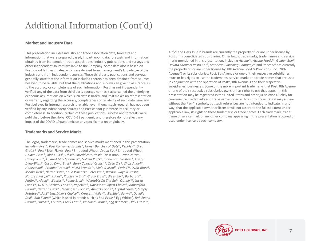 Additional Information (Cont’d) Prospective Financial Information The prospective financial information provided in this presentation regarding Post’s future performance, including Post’s Adjusted EBITDA and capital expenditures guidance for fiscal year 2023, Posts forecasted Adjusted EBITDA and synergies from the Pet Food acquisition, Post’s illustrative value (including illustrative Adjusted EBITDA) in future fiscal years, Post’s illustrative net debt reduction, Post’s expected rates of Adjusted EBITDA growth, Post’s net leverage, Post’s illustrative multiple, Post’s estimated increase in cash interest, Post’s anticipated normalization for Post’s Foodservice business, Post’s anticipated volume growth rates in Post’s Refrigerated Retail business, Post’s free cash flow and specific dollar amounts and other plans, expectations, estimates and similar statements, represents Post management’s estimates as of May 4, 2023 only (and is not therefore updated as of the date hereof) and are qualified by, and subject to, the assumptions and the other information set forth on the slides captioned “Cautionary Statement Regarding Forward-Looking Statements.” Post’s Adjusted EBITDA and capital expenditures guidance for fiscal year 2023, Post’s forecasted Adjusted EBITDA and synergies from the Pet Food acquisition, Post’s illustrative value (including illustrative Adjusted EBITDA) in future fiscal years, Post’s illustrative net debt reduction, Post’s expected rates of Adjusted EBITDA growth, Post’s net leverage, Post’s illustrative multiple, Post’s estimated increase in cash interest, Post’s anticipated normalization for Post’s Foodservice business, Post’s anticipated volume growth rates in Post’s Refrigerated Retail business, Post's free cash flow and the specific dollar amounts and other plans, expectations, estimates and similar statements contained in this presentation are based upon a number of assumptions and estimates that, while presented with numerical specificity, are inherently subject to business, economic and competitive uncertainties and contingencies, many of which are beyond Post’s control, are based upon specific assumptions with respect to future business decisions, some of which will change, and are necessarily speculative in nature. It can be expected that some or all of the assumptions inherent in the estimates will not materialize or will vary significantly from actual results. Accordingly, the information set forth herein is only an estimate as of May 4, 2023, and actual results will vary from the estimates set forth herein. Investors also should recognize that the reliability of any forecasted financial data diminishes the farther in the future that the data is forecast. In light of the foregoing, investors are urged to put Post’s Adjusted EBITDA and capital expenditures guidance for fiscal year 2023, Post’s forecasted Adjusted EBITDA and synergies from the Pet Food acquisition, Post’s illustrative value (including illustrative Adjusted EBITDA) in future fiscal years, Post’s illustrative net debt reduction, Post’s expected rates of Adjusted EBITDA growth, Post’s net leverage, Post’s illustrative multiple, Post’s estimated increase in cash interest, Post’s anticipated normalization for Post’s Foodservice business, Post’s anticipated volume growth rates in Post’s Refrigerated Retail business, Post’s free cash flow and other prospective financial information in context and not to rely on them. Post’s Adjusted EBITDA and capital expenditures guidance for fiscal year 2023, Post’s forecasted Adjusted EBITDA and synergies from the Pet Food acquisition, Post’s illustrative value (including illustrative Adjusted EBITDA) in future fiscal years, Post’s illustrative net debt reduction, Post’s expected rates of Adjusted EBITDA growth, Post’s net leverage, Post’s illustrative multiple, Post’s estimated increase in cash interest, Post’s anticipated normalization for Post’s Foodservice business, Post’s anticipated volume growth rates in Post’s Refrigerated Retail business and Post’s free cash flow are not prepared with a view toward compliance with published guidelines of the American Institute of Certified Public Accountants, and neither Post’s independent registered public accounting firm nor any other independent expert or outside party compiles or examines these estimates and, accordingly, no such person expresses any opinion or any other form of assurance with respect thereto. Any failure to successfully implement Post’s operating strategy or the occurrence of any of the events or circumstances set forth under “Cautionary Statement Regarding Forward-Looking Statements” in this presentation could result in the actual operating results being different than the estimates set forth herein, and such differences may be adverse and material. 6