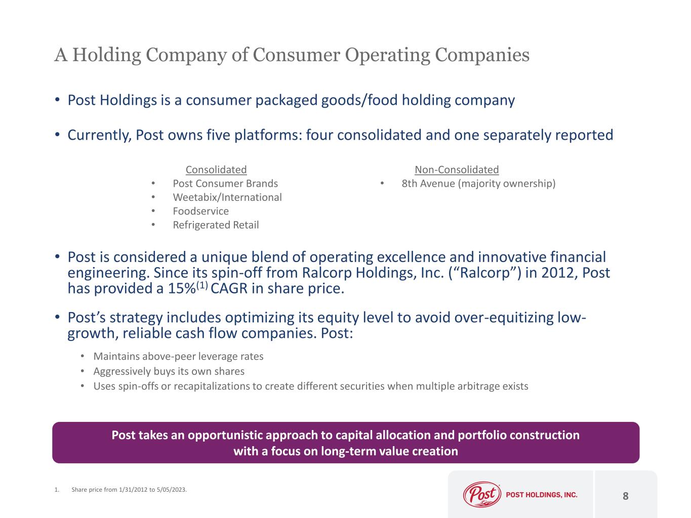 Additional Information (Cont’d) Market and Industry Data This presentation includes industry and trade association data, forecasts and information that were prepared based, in part, upon data, forecasts and information obtained from independent trade associations, industry publications and surveys and other independent sources available to the Company. Some data also is based on Post’s good faith estimates, which are derived from management’s knowledge of the industry and from independent sources. These third party publications and surveys generally state that the information included therein has been obtained from sources believed to be reliable, but that the publications and surveys can give no assurance as to the accuracy or completeness of such information. Post has not independently verified any of the data from third party sources nor has it ascertained the underlying economic assumptions on which such data is based, and Post makes no representation or warranty regarding the accuracy, completeness or reliability of such data. Similarly, Post believes its internal research is reliable, even though such research has not been verified by any independent sources and Post cannot guarantee its accuracy or completeness. In addition, certain of these publications, surveys and forecasts were published before the global COVID-19 pandemic and therefore do not reflect any impact of the COVID-19 pandemic on any specific market or globally. Trademarks and Service Marks The logos, trademarks, trade names and service marks mentioned in this presentation, including Post®, Post Consumer Brands®, Honey Bunches of Oats®, Pebbles®, Great Grains®, Post® Bran Flakes, Post® Shredded Wheat, Spoon Size® Shredded Wheat, Golden Crisp®, Alpha-Bits®, Ohs!®, Shreddies™, Post® Raisin Bran, Grape-Nuts®, Honeycomb®, Frosted Mini Spooners®, Golden Puffs®, Cinnamon Toasters®, Fruity Dyno-Bites®, Cocoa Dyno-Bites®, Berry Colossal Crunch®, Oreo O’s®, Chips Ahoy!®, Honeymaid®, Premier Protein®, MOM Brands ™, Malt-O-Meal®, Farina™, Dyno-Bites®, Mom’s Best®, Better Oats®, CoCo Wheats®, Peter Pan®, Rachael Ray® Nutrish®, Nature’s Recipe®, 9Lives®, Kibbles `n Bits®, Gravy Train®, Weetabix®, Barbara’s®, Puffins®, Alpen®, Weetos™, Ready Brek™, Weetabix On The Go™, Oatibix™, Lacka Foods™, UFIT™, Michael Foods™, Papetti’s®, Davidson’s Safest Choice®, Abbotsford Farms®, Better’n Eggs®, Henningsen Foods™, Almark Foods™, Crystal Farms®, Simply Potatoes®, Just® Egg, Diner’s Choice™, Crescent Valley®, Westfield Farms®, David’s Deli®, Bob Evans® (which is used in brands such as Bob Evans® Egg Whites), Bob Evans Farms®, Owens®, Country Creek Farm®, Pineland Farms®, Egg Beaters®, Old El Paso™, Airly® and Oat Clouds® brands are currently the property of, or are under license by, Post or its consolidated subsidiaries. Other logos, trademarks, trade names and service marks mentioned in this presentation, including Attune™, Attune Foods™, Golden Boy®, Dakota Growers Pasta Co.®, American Blanching Company™ and Ronzoni® are currently the property of, or are under license by, 8th Avenue Food & Provisions, Inc. (“8th Avenue”) or its subsidiaries. Post, 8th Avenue or one of their respective subsidiaries owns or has rights to use the trademarks, service marks and trade names that are used in conjunction with the operation of Post’s, 8th Avenue’s and their respective subsidiaries’ businesses. Some of the more important trademarks that Post, 8th Avenue or one of their respective subsidiaries owns or has rights to use that appear in this presentation may be registered in the United States and other jurisdictions. Solely for convenience, trademarks and trade names referred to in this presentation may appear without the ® or ™ symbols, but such references are not intended to indicate, in any way, that the applicable owner or licensor will not assert, to the fullest extent under applicable law, its rights to these trademarks or trade names. Each trademark, trade name or service mark of any other company appearing in this presentation is owned or used under license by such company. 7