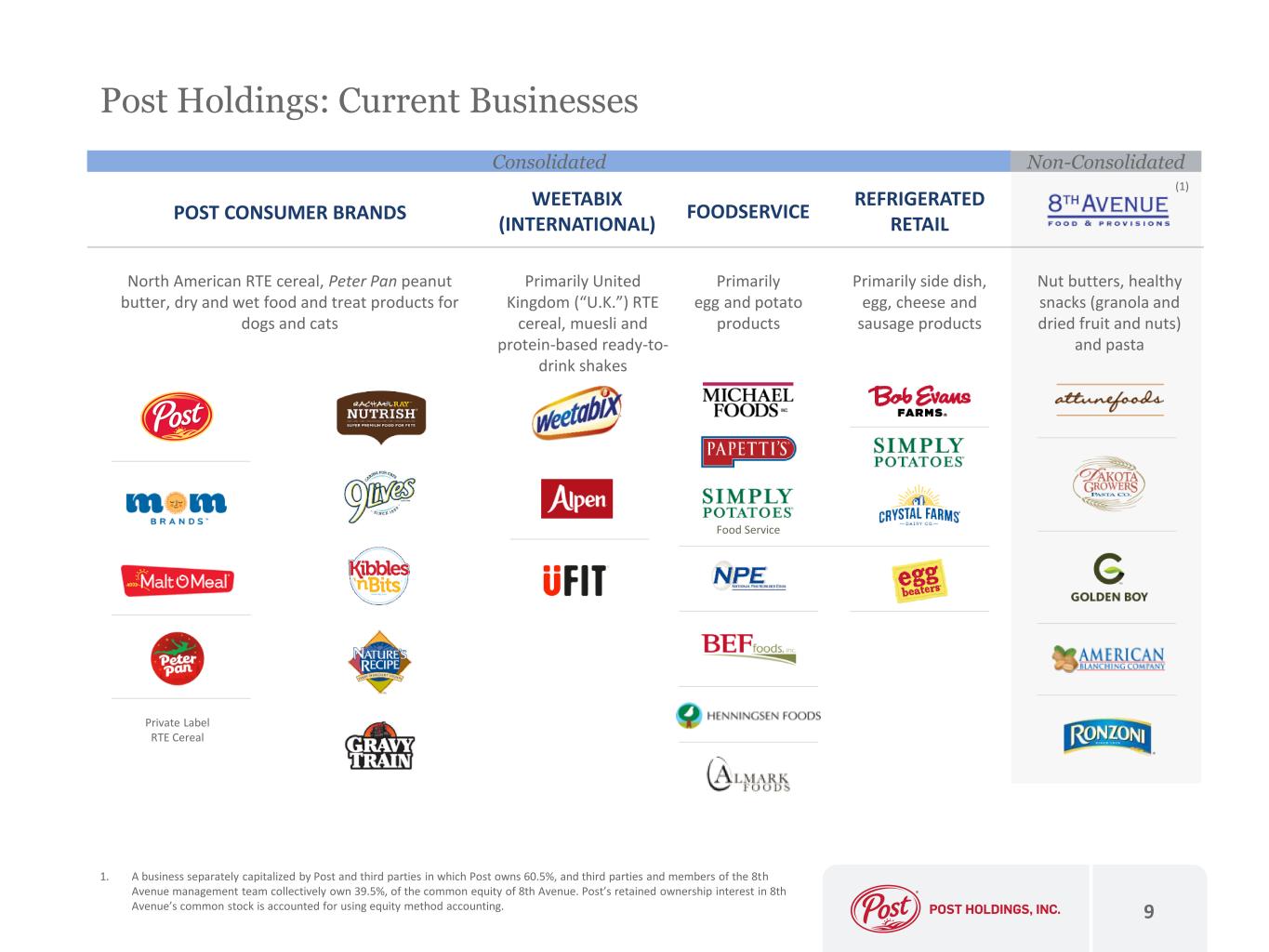 9 Post Holdings: Current Businesses WEETABIX (INTERNATIONAL) Primarily United Kingdom (“U.K.”) RTE cereal, muesli and protein-based ready-to- drink shakes Primarily egg and potato products FOODSERVICEPOST CONSUMER BRANDS North American RTE cereal, Peter Pan peanut butter, dry and wet food and treat products for dogs and cats REFRIGERATED RETAIL Primarily side dish, egg, cheese and sausage products Nut butters, healthy snacks (granola and dried fruit and nuts) and pasta (1) 1. A business separately capitalized by Post and third parties in which Post owns 60.5%, and third parties and members of the 8th Avenue management team collectively own 39.5%, of the common equity of 8th Avenue. Post’s retained ownership interest in 8th Avenue’s common stock is accounted for using equity method accounting. Food Service Private Label RTE Cereal Consolidated Non-Consolidated