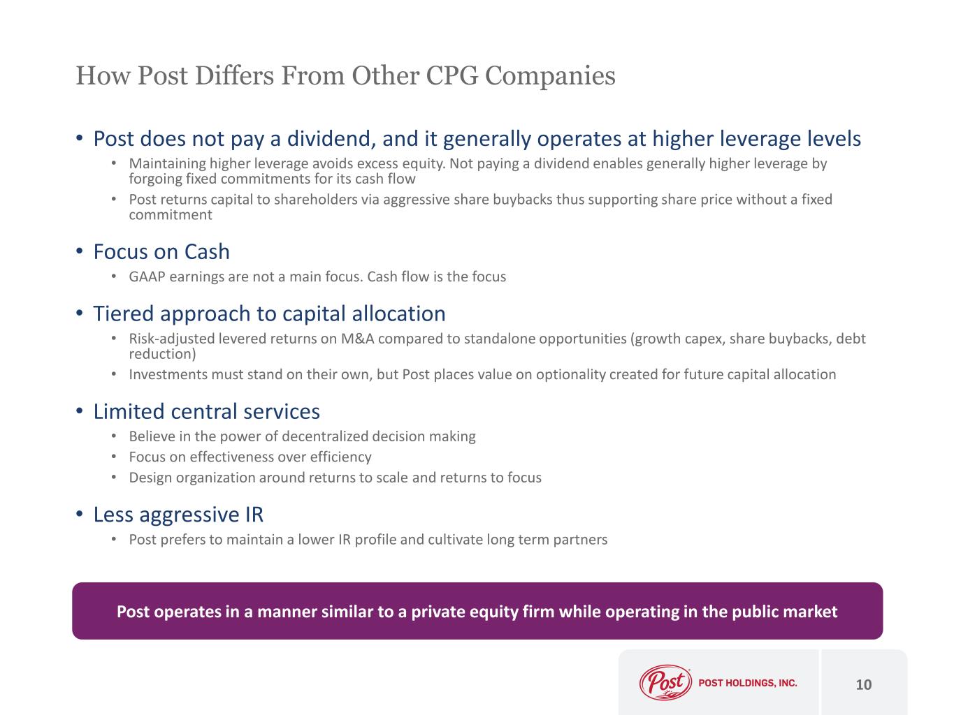 • Post does not pay a dividend, and it generally operates at higher leverage levels • Maintaining higher leverage avoids excess equity. Not paying a dividend enables generally higher leverage by forgoing fixed commitments for its cash flow • Post returns capital to shareholders via aggressive share buybacks thus supporting share price without a fixed commitment • Focus on Cash • GAAP earnings are not a main focus. Cash flow is the focus • Tiered approach to capital allocation • Risk-adjusted levered returns on M&A compared to standalone opportunities (growth capex, share buybacks, debt reduction) • Investments must stand on their own, but Post places value on optionality created for future capital allocation • Limited central services • Believe in the power of decentralized decision making • Focus on effectiveness over efficiency • Design organization around returns to scale and returns to focus • Less aggressive IR • Post prefers to maintain a lower IR profile and cultivate long term partners 10 How Post Differs From Other CPG Companies Post operates in a manner similar to a private equity firm while operating in the public market