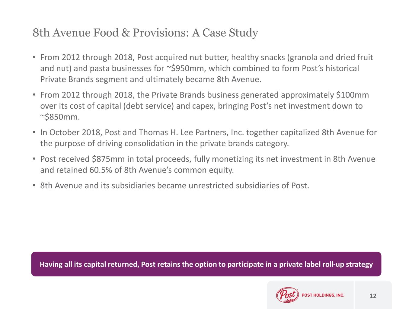 BellRing Brands: A Case Study • From September 2013 through October 2014, Post acquired Premier Protein, Dymatize and PowerBar for ~$700mm. These brands combined to form Post’s historical Active Nutrition segment and eventually became BellRing (NYSE: BRBR). • From October 2014 through October 2019, the Active Nutrition business generated approximately $250mm over its cost of capital (debt service) bringing Post’s net investment down to ~$450mm. • In October 2019, BellRing was formed as a holding company for the Active Nutrition business, and Post sold ~29% of its ownership in an initial public offering, receiving $1,225mm in proceeds, which were used to retire Post debt. • In March 2022, Post completed the spin-off of BellRing, distributing ~80% of its interest in BellRing to Post shareholders (>$2bn in value). In connection with the spin-off transactions, including a debt-for-debt exchange, Post received $290mm of incremental value, which resulted in an equivalent reduction in Post’s net debt. • In August 2022 and November 2022, Post executed debt-for-equity exchanges, monetizing all of its remaining shares of BellRing common stock. In connection with these transactions, Post retired ~$500mm in Post debt. 11 For a ~$450mm net investment, Post distributed over $2bn of value in BellRing shares to Post shareholders and retired ~$2bn in Post debt, all tax-free, equating to a >30% IRR.