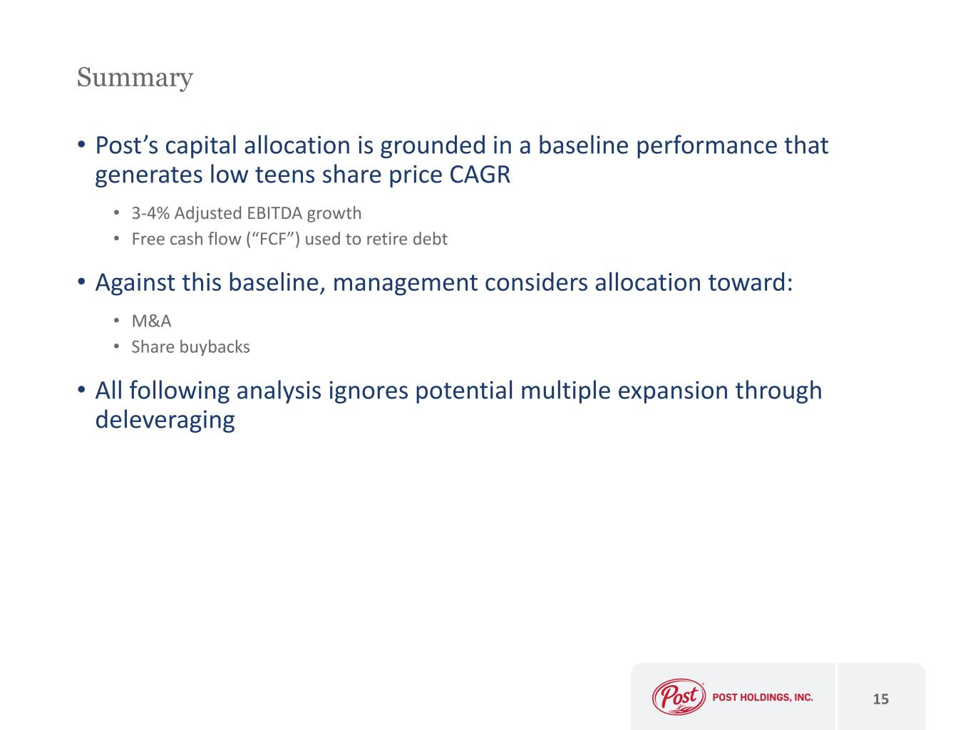 • Post’s capital allocation is grounded in a baseline performance that generates low teens share price CAGR • 3-4% Adjusted EBITDA growth • Free cash flow (“FCF”) used to retire debt • Against this baseline, management considers allocation toward: • M&A • Share buybacks • All following analysis ignores potential multiple expansion through deleveraging 15 Summary