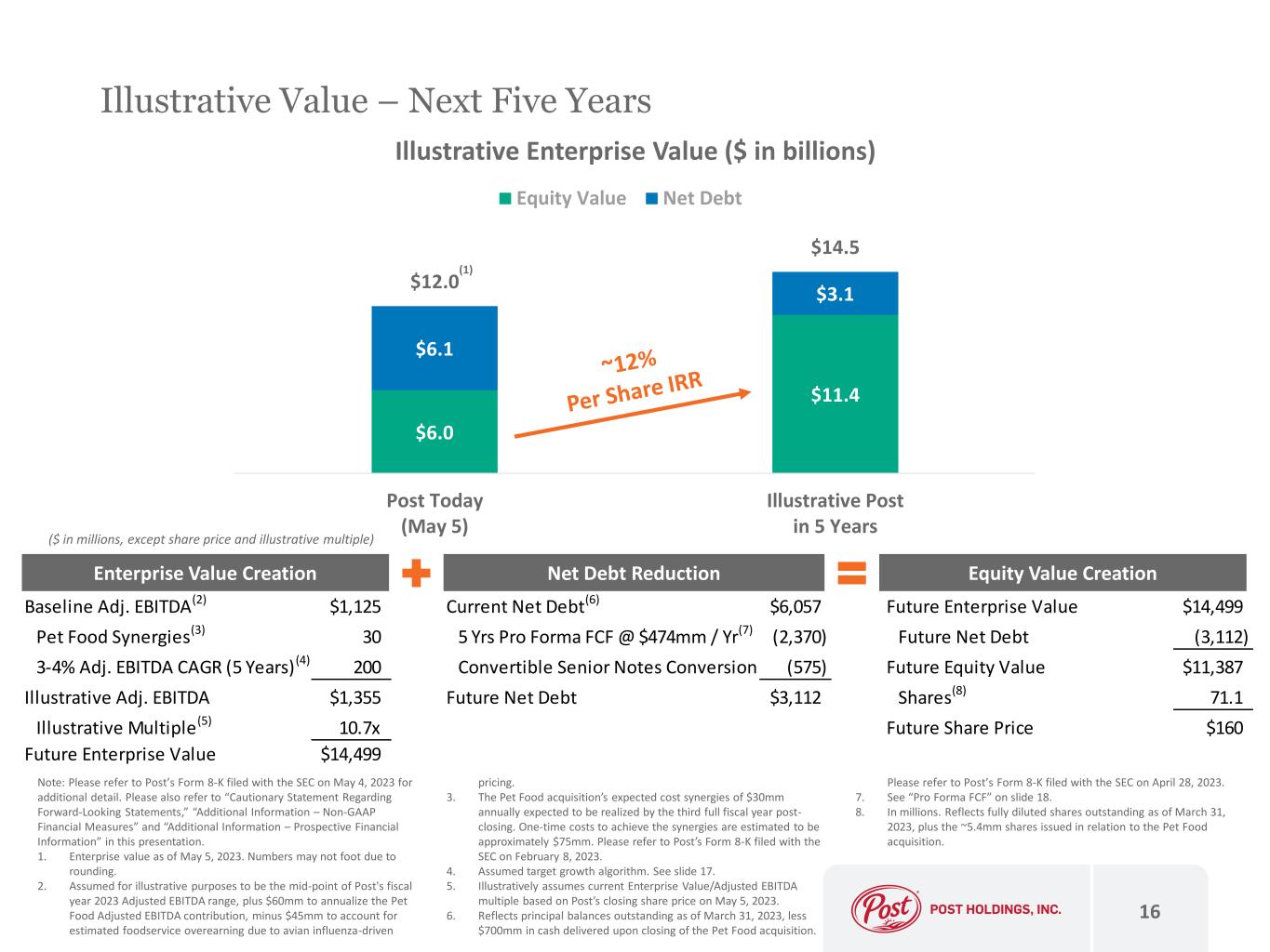 Baseline Adj. EBITDA(2) $1,125 Current Net Debt(6) $6,057 Future Enterprise Value $14,499 Pet Food Synergies(3) 30 5 Yrs Pro Forma FCF @ $474mm / Yr(7) (2,370) Future Net Debt (3,112) 3-4% Adj. EBITDA CAGR (5 Years)(4) 200 Convertible Senior Notes Conversion (575) Future Equity Value $11,387 Illustrative Adj. EBITDA $1,355 Future Net Debt $3,112 Shares(8) 71.1 Illustrative Multiple(5) 10.7x Future Share Price $160 Future Enterprise Value $14,499 Note: Please refer to Post’s Form 8-K filed with the SEC on May 4, 2023 for additional detail. Please also refer to “Cautionary Statement Regarding Forward-Looking Statements,” “Additional Information – Non-GAAP Financial Measures” and “Additional Information – Prospective Financial Information” in this presentation. 1. Enterprise value as of May 5, 2023. Numbers may not foot due to rounding. 2. Assumed for illustrative purposes to be the mid-point of Post's fiscal year 2023 Adjusted EBITDA range, plus $60mm to annualize the Pet Food Adjusted EBITDA contribution, minus $45mm to account for estimated foodservice overearning due to avian influenza-driven pricing. 3. The Pet Food acquisition’s expected cost synergies of $30mm annually expected to be realized by the third full fiscal year post- closing. One-time costs to achieve the synergies are estimated to be approximately $75mm. Please refer to Post’s Form 8-K filed with the SEC on February 8, 2023. 4. Assumed target growth algorithm. See slide 17. 5. Illustratively assumes current Enterprise Value/Adjusted EBITDA multiple based on Post’s closing share price on May 5, 2023. 6. Reflects principal balances outstanding as of March 31, 2023, less $700mm in cash delivered upon closing of the Pet Food acquisition. Please refer to Post’s Form 8-K filed with the SEC on April 28, 2023. 7. See “Pro Forma FCF” on slide 18. 8. In millions. Reflects fully diluted shares outstanding as of March 31, 2023, plus the ~5.4mm shares issued in relation to the Pet Food acquisition. Illustrative Value – Next Five Years 16 $6.0 $11.4 $6.1 $3.1 $12.0 $14.5 Post Today (May 5) Illustrative Post in 5 Years Illustrative Enterprise Value ($ in billions) Equity Value Net Debt Enterprise Value Creation Net Debt Reduction Equity Value Creation ($ in millions, except share price and illustrative multiple) (1)