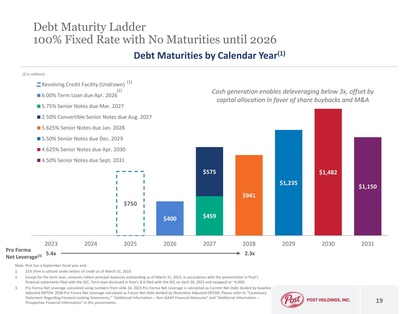 Post Forecasted Adjusted EBITDA(1)(2) 1,110$ Annualization of Pet Food Adjusted EBITDA Contribution(1)(3) 60 Pet Food Run Rate Synergies(4) 30 Normalization of Foodservice Business(5) (45) Post Consolidated Forecasted Adjusted EBITDA 1,155$ Less: Cash Interest(6) (304) Less: Estimated Maintenance Capital Expenditures (275) Less: Normalized Cash Taxes (102) Pro Forma FCF(1) 474$ FCF as % of forecasted consolidated Adjusted EBITDA 41.0% Free Cash Flow Generation 18 • Recurring revenue stream supported by strong or growing market positions or attractive category trends • Attractive Adjusted EBITDA margins • Limited maintenance capex needs • Modest working capital requirements • M&A tax efficiency where possible Key Cash Flow Characteristics Illustrative Free Cash Flow(1) Calculation ($ in millions) 1. Please refer to Post’s Form 8-K filed with the SEC on May 4, 2023 for additional detail. Please also refer to “Cautionary Statement Regarding Forward-Looking Statements,” “Additional Information – Non-GAAP Financial Measures” and “Additional Information – Prospective Financial Information” in this presentation. 2. Assumed for illustrative purposes to be the mid-point of Post's fiscal year 2023 Adjusted EBITDA range. 3. Seven months of contribution from the Pet Food acquisition. Please refer to Post’s Form 8-K filed with the SEC on May 4, 2023 for additional detail. 4. The Pet Food acquisition’s expected cost synergies of $30mm annually expected to be realized by the third full fiscal year post-closing. One-time costs to achieve the synergies are estimated to be approximately $75mm. Please refer to Post’s Form 8-K filed with the SEC on February 8, 2023. 5. Estimated foodservice overearning due to avian influenza-driven pricing. 6. Reflects an estimated increase in cash interest resulting from the $400mm term loan disclosed in Post’s 8-K filed with the SEC on April 26, 2023 and swapped at ~6.00%. Maintenance capital expenditures exclude profit enhancing projects such as the construction of the shake processing facility in West Jefferson, Ohio and the expansion of the Norwalk, Iowa precooked egg manufacturing facility