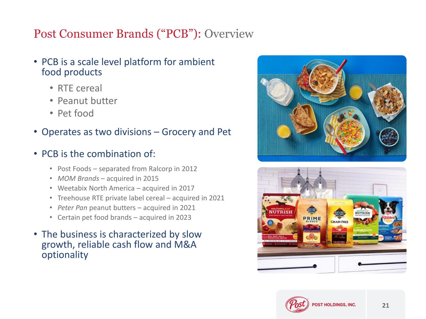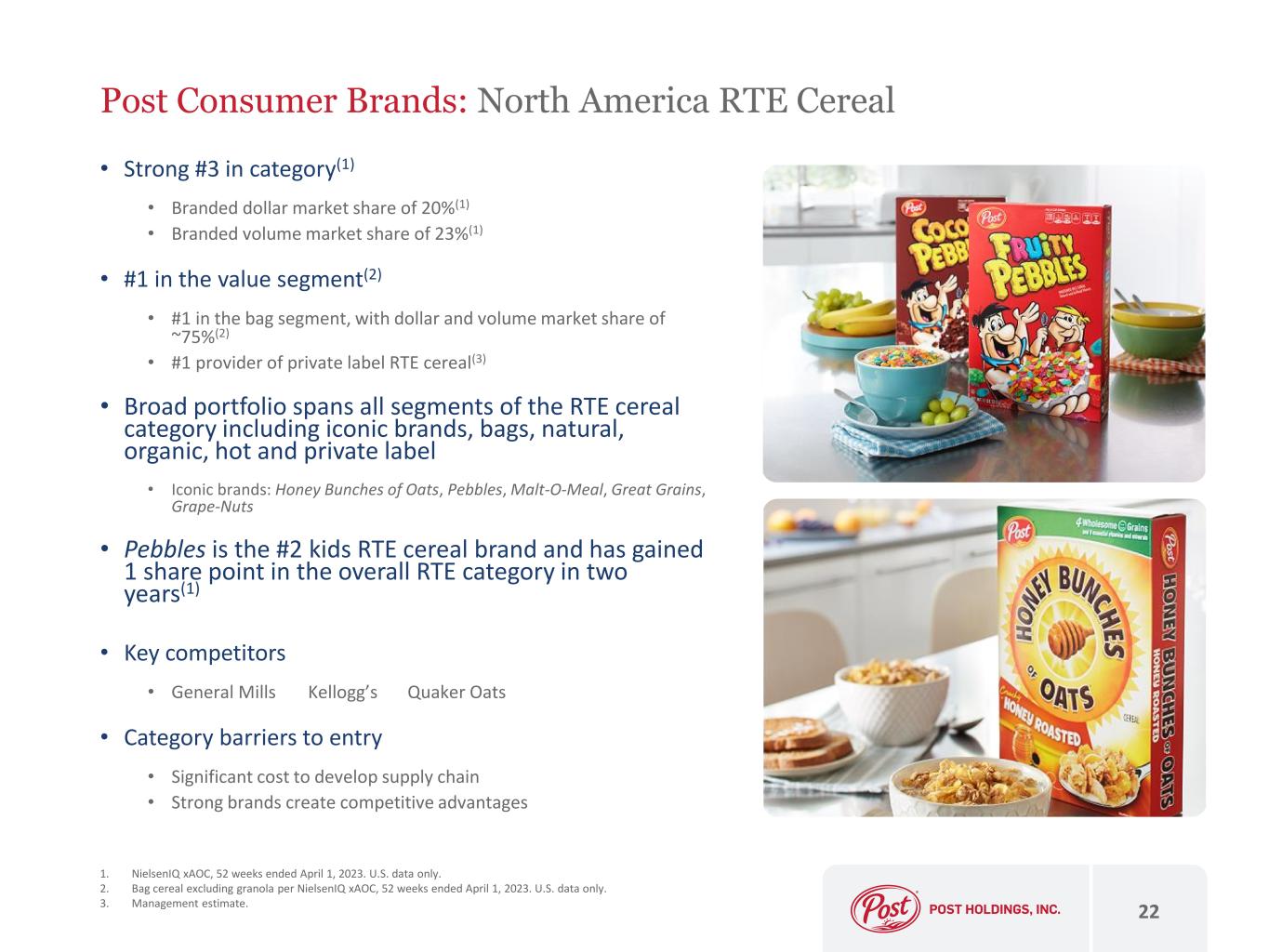 • PCB is a scale level platform for ambient food products • RTE cereal • Peanut butter • Pet food • Operates as two divisions – Grocery and Pet • PCB is the combination of: • Post Foods – separated from Ralcorp in 2012 • MOM Brands – acquired in 2015 • Weetabix North America – acquired in 2017 • Treehouse RTE private label cereal – acquired in 2021 • Peter Pan peanut butters – acquired in 2021 • Certain pet food brands – acquired in 2023 • The business is characterized by slow growth, reliable cash flow and M&A optionality 21 Post Consumer Brands (“PCB”): Overview