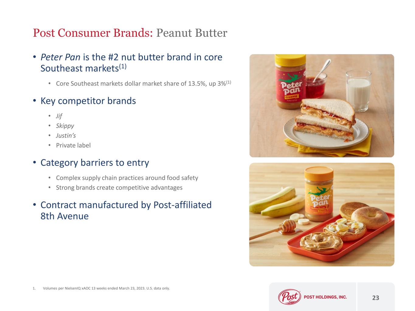 Post Consumer Brands: North America RTE Cereal 22 • Strong #3 in category(1) • Branded dollar market share of 20%(1) • Branded volume market share of 23%(1) • #1 in the value segment(2) • #1 in the bag segment, with dollar and volume market share of ~75%(2) • #1 provider of private label RTE cereal(3) • Broad portfolio spans all segments of the RTE cereal category including iconic brands, bags, natural, organic, hot and private label • Iconic brands: Honey Bunches of Oats, Pebbles, Malt-O-Meal, Great Grains, Grape-Nuts • Pebbles is the #2 kids RTE cereal brand and has gained 1 share point in the overall RTE category in two years(1) • Key competitors • General Mills Kellogg’s Quaker Oats • Category barriers to entry • Significant cost to develop supply chain • Strong brands create competitive advantages 1. NielsenIQ xAOC, 52 weeks ended April 1, 2023. U.S. data only. 2. Bag cereal excluding granola per NielsenIQ xAOC, 52 weeks ended April 1, 2023. U.S. data only. 3. Management estimate.