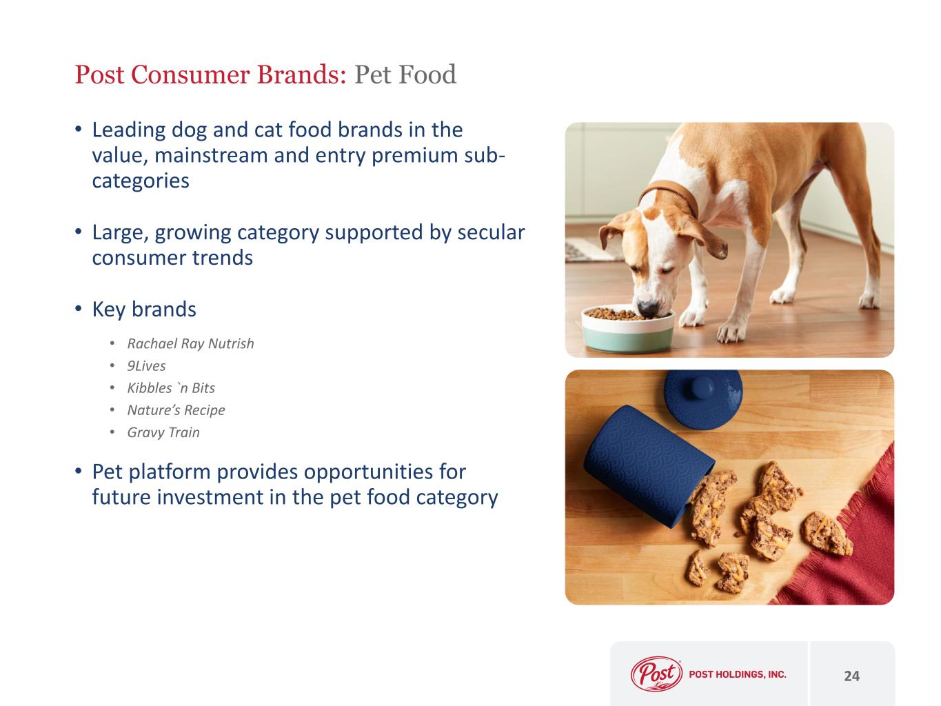 Post Consumer Brands: Peanut Butter 23 • Peter Pan is the #2 nut butter brand in core Southeast markets(1) • Core Southeast markets dollar market share of 13.5%, up 3%(1) • Key competitor brands • Jif • Skippy • Justin’s • Private label • Category barriers to entry • Complex supply chain practices around food safety • Strong brands create competitive advantages • Contract manufactured by Post-affiliated 8th Avenue 1. Volumes per NielsenIQ xAOC 13 weeks ended March 23, 2023. U.S. data only.