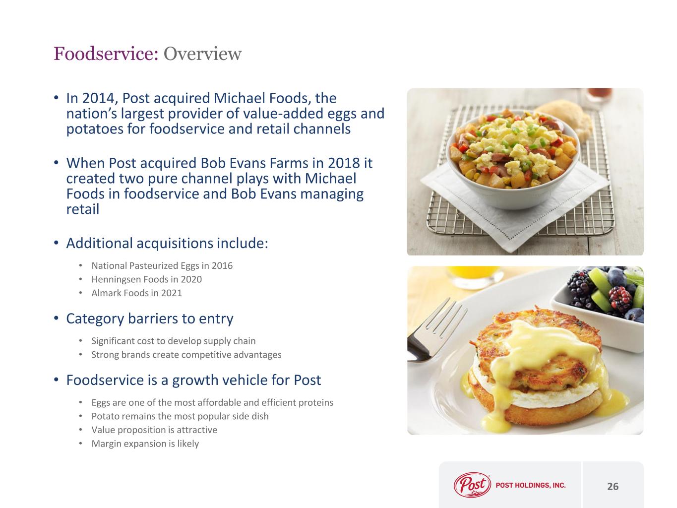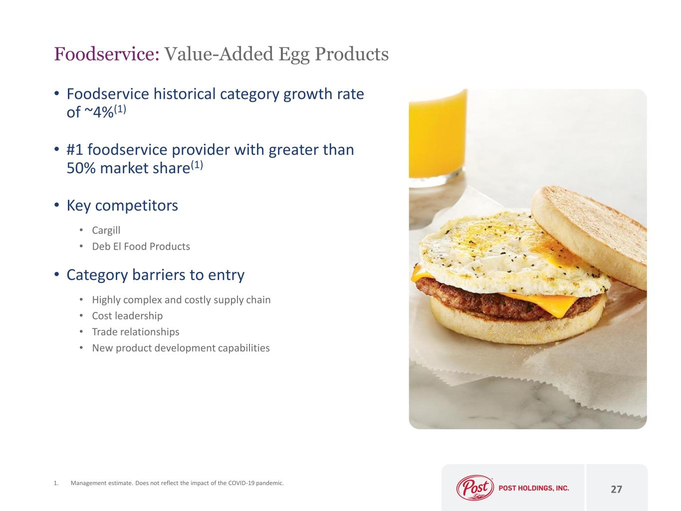 • In 2014, Post acquired Michael Foods, the nation’s largest provider of value-added eggs and potatoes for foodservice and retail channels • When Post acquired Bob Evans Farms in 2018 it created two pure channel plays with Michael Foods in foodservice and Bob Evans managing retail • Additional acquisitions include: • National Pasteurized Eggs in 2016 • Henningsen Foods in 2020 • Almark Foods in 2021 • Category barriers to entry • Significant cost to develop supply chain • Strong brands create competitive advantages • Foodservice is a growth vehicle for Post • Eggs are one of the most affordable and efficient proteins • Potato remains the most popular side dish • Value proposition is attractive • Margin expansion is likely 26 Foodservice: Overview