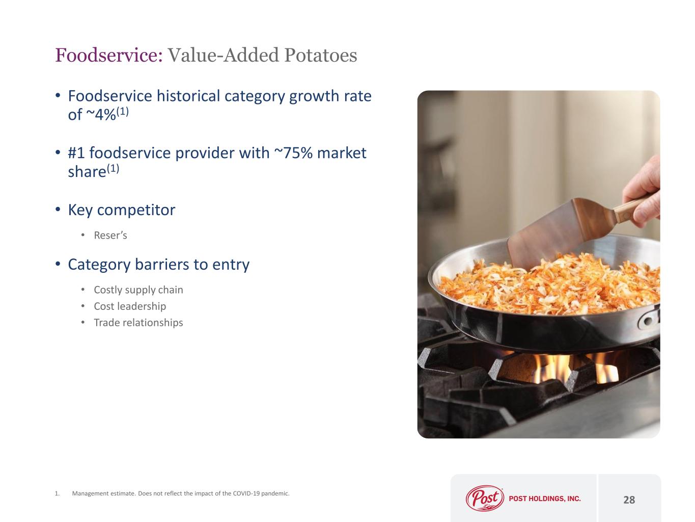 Foodservice: Value-Added Egg Products 27 • Foodservice historical category growth rate of ~4%(1) • #1 foodservice provider with greater than 50% market share(1) • Key competitors • Cargill • Deb El Food Products • Category barriers to entry • Highly complex and costly supply chain • Cost leadership • Trade relationships • New product development capabilities 1. Management estimate. Does not reflect the impact of the COVID-19 pandemic.