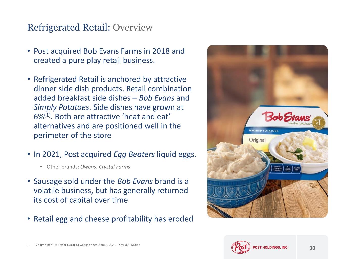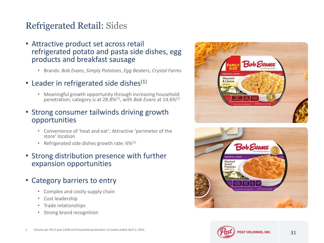 • Post acquired Bob Evans Farms in 2018 and created a pure play retail business. • Refrigerated Retail is anchored by attractive dinner side dish products. Retail combination added breakfast side dishes – Bob Evans and Simply Potatoes. Side dishes have grown at 6%(1). Both are attractive ‘heat and eat’ alternatives and are positioned well in the perimeter of the store • In 2021, Post acquired Egg Beaters liquid eggs. • Other brands: Owens, Crystal Farms • Sausage sold under the Bob Evans brand is a volatile business, but has generally returned its cost of capital over time • Retail egg and cheese profitability has eroded 30 Refrigerated Retail: Overview 1. Volume per IRI; 4-year CAGR 13 weeks ended April 2, 2023. Total U.S. MULO.