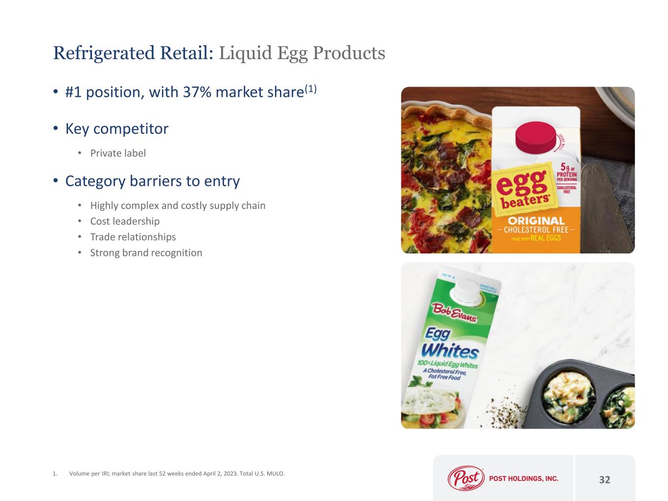 Refrigerated Retail: Sides 31 • Attractive product set across retail refrigerated potato and pasta side dishes, egg products and breakfast sausage • Brands: Bob Evans, Simply Potatoes, Egg Beaters, Crystal Farms • Leader in refrigerated side dishes(1) • Meaningful growth opportunity through increasing household penetration; category is at 28.8%(1), with Bob Evans at 14.6%(1) • Strong consumer tailwinds driving growth opportunities • Convenience of ‘heat and eat’; Attractive ‘perimeter of the store’ location • Refrigerated side dishes growth rate: 6%(1) • Strong distribution presence with further expansion opportunities • Category barriers to entry • Complex and costly supply chain • Cost leadership • Trade relationships • Strong brand recognition 1. Volume per IRI; 4-year CAGR and household penetration 13 weeks ended April 2, 2023.