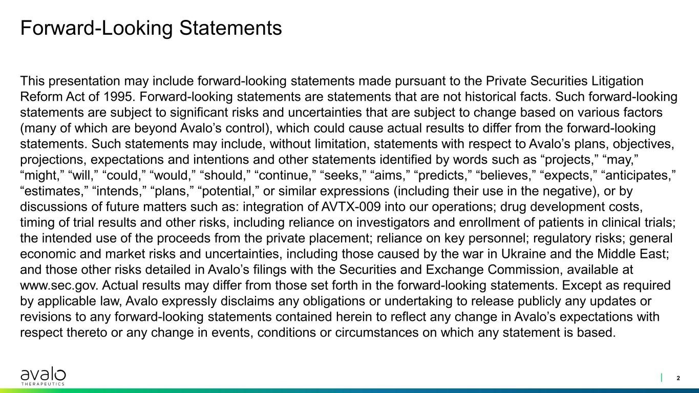Forward-Looking Statements This presentation may include forward-looking statements made pursuant to the Private Securities Litigation Reform Act of 1995. Forward-looking statements are statements that are not historical facts. Such forward-looking statements are subject to significant risks and uncertainties that are subject to change based on various factors (many of which are beyond Avalo’s control), which could cause actual results to differ from the forward-looking statements. Such statements may include, without limitation, statements with respect to Avalo’s plans, objectives, projections, expectations and intentions and other statements identified by words such as “projects,” “may,” “might,” “will,” “could,” “would,” “should,” “continue,” “seeks,” “aims,” “predicts,” “believes,” “expects,” “anticipates,” “estimates,” “intends,” “plans,” “potential,” or similar expressions (including their use in the negative), or by discussions of future matters such as: integration of AVTX-009 into our operations; drug development costs, timing of trial results and other risks, including reliance on investigators and enrollment of patients in clinical trials; the intended use of the proceeds from the private placement; reliance on key personnel; regulatory risks; general economic and market risks and uncertainties, including those caused by the war in Ukraine and the Middle East; and those other risks detailed in Avalo’s filings with the Securities and Exchange Commission, available at www.sec.gov. Actual results may differ from those set forth in the forward-looking statements. Except as required by applicable law, Avalo expressly disclaims any obligations or undertaking to release publicly any updates or revisions to any forward-looking statements contained herein to reflect any change in Avalo’s expectations with respect thereto or any change in events, conditions or circumstances on which any statement is based. 2