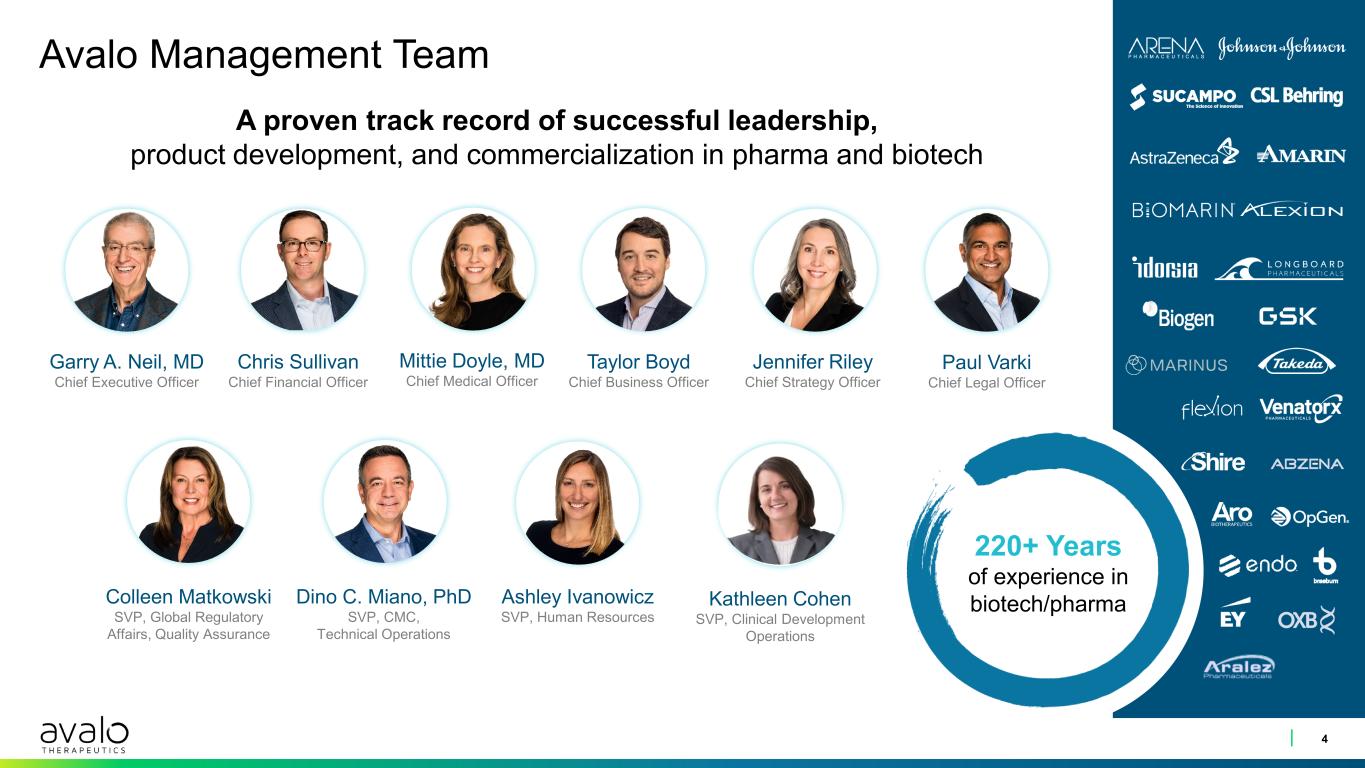 Avalo Therapeutics: Advancing the Next-Generation of IL-1β Inhibition for Immune-Mediated Inflammatory Diseases 3 IL, interleukin; IND, investigational new drug application; mAB, monoclonal antibody; MOA, mechanism of action. 1. Vossen ARJV, et al. J Invest Dermatol. 2020;140(7):1463-1466.e2; 2. Kelly G, et al. Br J Dermatol. 2015;173(6):1431-1439; 3. Kimball AB, et al. Presented at: American Academy of Dermatology; March 8-12, 2024; San Diego, CA; 4. Bihorel S, et al. AAPS J. 2014;16(5):1009-1017; 5. HS Market Research 2024. Lead compound AVTX-009 (anti-IL-1β mAb) has the potential for best-in-class and best-in-disease profile in hidradenitis suppurativa (HS) • Significant unmet need due to incomplete response and loss of response to current treatment • Abbvie’s lutikizumab (IL-1α/β) demonstrated favorable phase 2 efficacy to market leaders and pipeline therapeutics in a refractory population that had failed anti-TNF therapy​ • IL-1β (not IL-1α) is a key immunoregulator in HS, based on preclinical and clinical evidence1,2,3 • AVTX-009 has 15x higher affinity and a longer half-life than lutikizumab, potentially predictive of higher efficacy and less frequent dosing​4 Phase 2 LOTUS trial in HS enrollment complete with topline data expected Q2 2026 HS market is expected to grow to > $10B by 20355 AVTX-009 has the potential to treat additional immune- mediated inflammatory diseases Expected cash runway into 2028