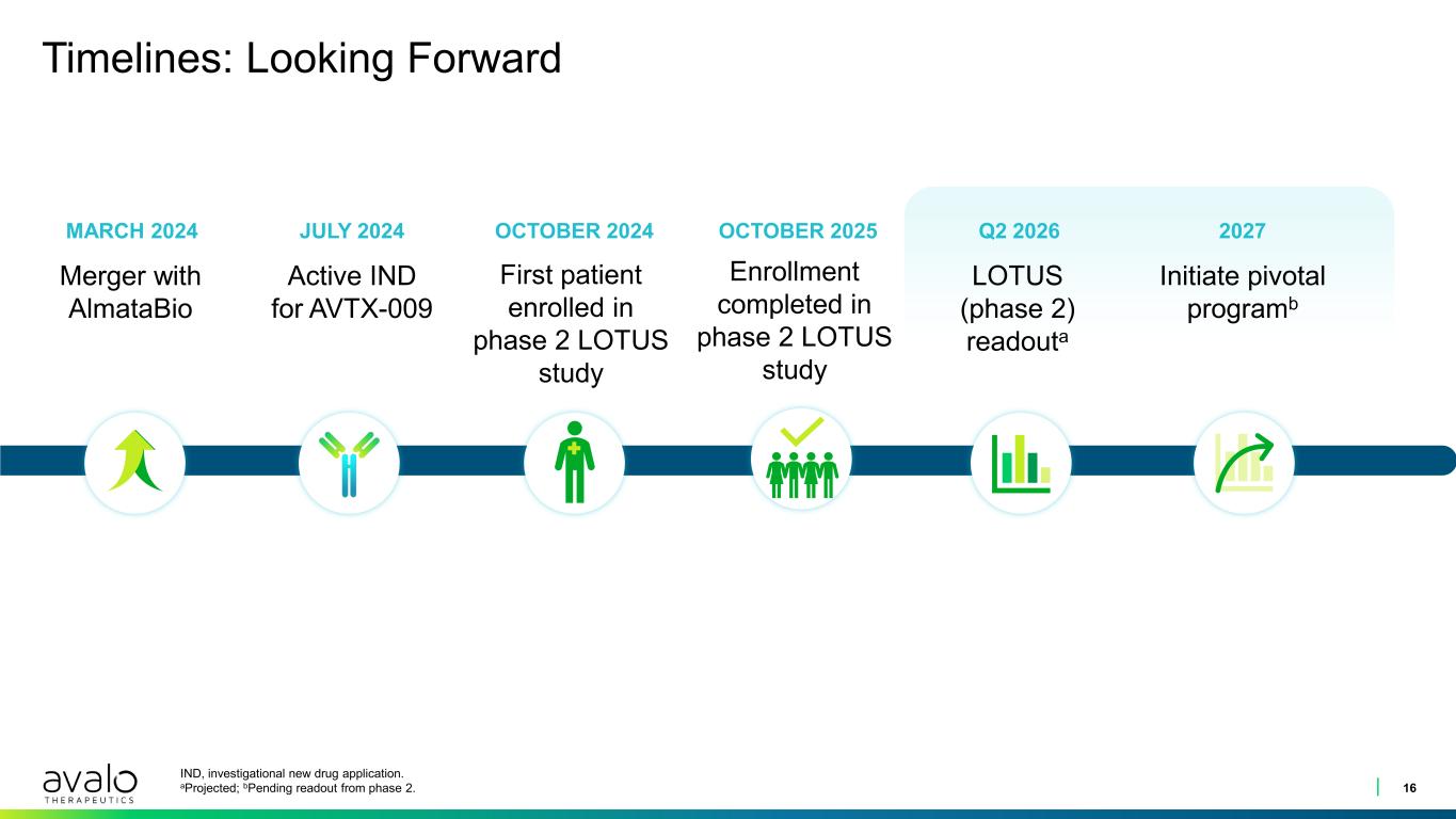 Diagnosed and Treated HS Population is Projected to Grow Substantially into a $10B+ Global Market by 20351 15 HCP, healthcare provider; HS, hidradenitis suppurativa; U.S., United States. 1. HS Market Research 2024. Avalo Therapeutics Data on File; 2. Nguyen TV, et al. J Eur Acad Dermatol Venereol. 2021;35(1):50-61; 3. Garg AX, et al. Dermatol Ther. 2022;3:581-594; 4. Ingram JR, et al. J Eur Acad Dermatol Venereol. 2022;36(9):1597-1605; 5. Rinderknecht FB, Naik HB. Int J Womens Dermatol. 2024;10(1):e130. HS affects an estimated 1–4% of the population globally; 0.5% US population CAGR 3.4 MILLION IN 2024 3.5 MILLION PROJECTED IN 2035 1.0 MILLION IN 2024 1.6 MILLION PROJECTED IN 2035 ~100 THOUSAND IN 2024 >200 THOUSAND PROJECTED IN 2035 320 THOUSAND IN 2024 >500 THOUSAND PROJECTED IN 2035 HS prevalence (U.S.)2 HS diagnosed and treated (U.S)3 Growth in the number of diagnosed and treated patients from 30% to 45% of the total population, driven by new development and visibility with HCPs and patients Moderate-to-severe HS (U.S.)4 Increased recognition of disease leads to 60% growth of identified moderate to severe HS Biologics treated (U.S.)5 New approvals will lead to more patients being treated with biologics, increasing to ~40% share of segment (evidenced by the recent quickly growing use of Cosentyx and Bimzelx)