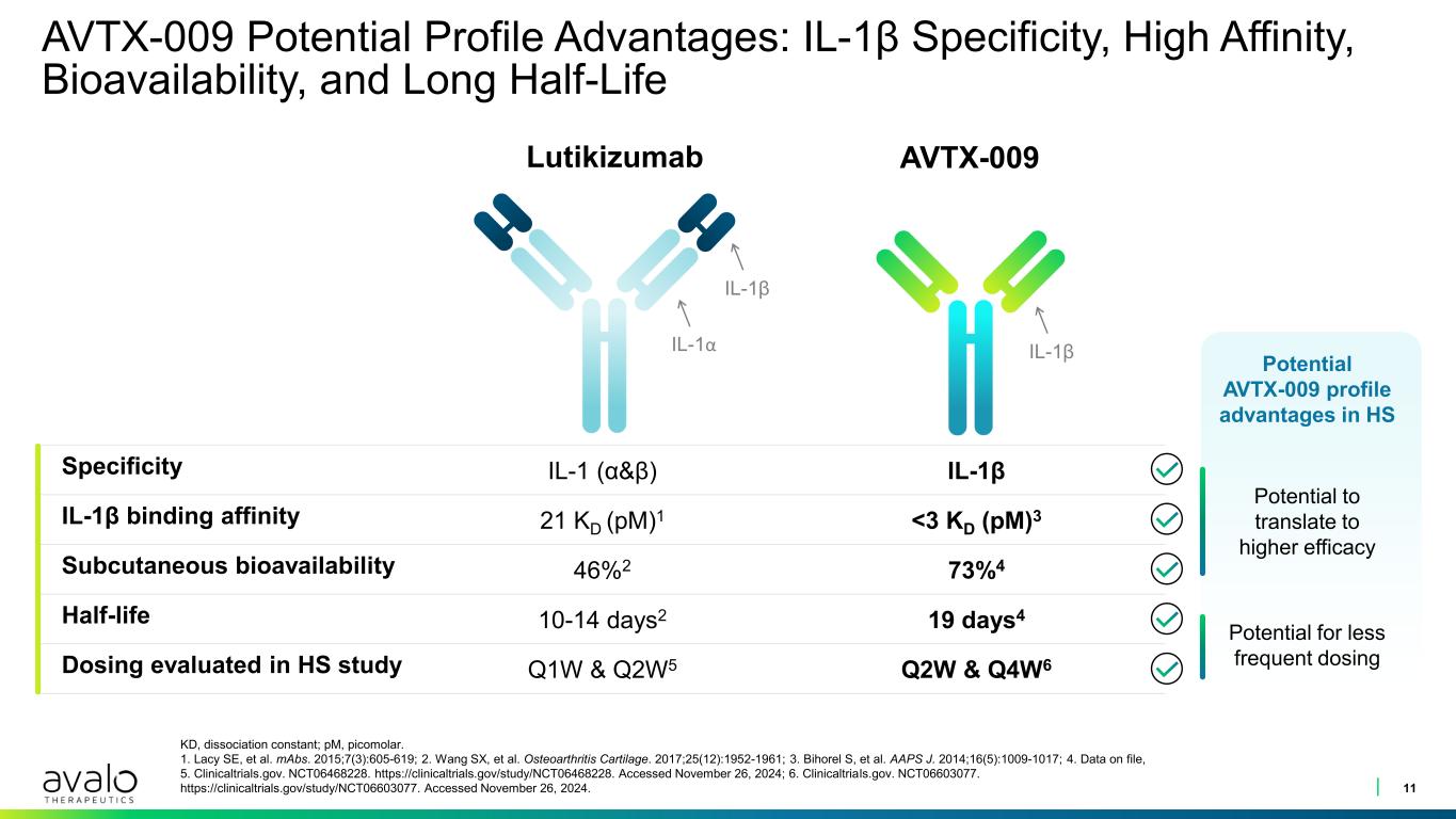 Specificity IL-1 (α&β) IL-1β IL-1β binding affinity 21 KD (pM)1 <3 KD (pM)3 Subcutaneous bioavailability 46%2 73%4 Half-life 10-14 days2 19 days4 Dosing evaluated in HS study Q1W & Q2W5 Q2W & Q4W6 AVTX-009 Potential Profile Advantages: IL-1β Specificity, High Affinity, Bioavailability, and Long Half-Life 11 KD, dissociation constant; pM, picomolar. 1. Lacy SE, et al. mAbs. 2015;7(3):605-619; 2. Wang SX, et al. Osteoarthritis Cartilage. 2017;25(12):1952-1961; 3. Bihorel S, et al. AAPS J. 2014;16(5):1009-1017; 4. Data on file, 5. Clinicaltrials.gov. NCT06468228. https://clinicaltrials.gov/study/NCT06468228. Accessed November 26, 2024; 6. Clinicaltrials.gov. NCT06603077. https://clinicaltrials.gov/study/NCT06603077. Accessed November 26, 2024. Lutikizumab AVTX-009 IL-1β Potential AVTX-009 profile advantages in HS Potential to translate to higher efficacy Potential for less frequent dosing IL-1β IL-1α