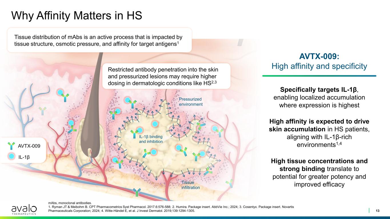 Why Affinity Matters in HS 13 mAbs, monoclonal antibodies. 1. Ryman JT & Meibohm B. CPT Pharmacometrics Syst Pharmacol. 2017.6:576-588; 2. Humira. Package insert. AbbVie Inc.; 2024; 3. Cosentyx. Package insert. Novartis Pharmaceuticals Corporation; 2024; 4. Witte-Händel E, et al. J Invest Dermatol. 2019;139:1294-1305. IL-1β AVTX-009 Tissue distribution of mAbs is an active process that is impacted by tissue structure, osmotic pressure, and affinity for target antigens1 AVTX-009: High affinity and specificity Specifically targets IL-1β, enabling localized accumulation where expression is highest Restricted antibody penetration into the skin and pressurized lesions may require higher dosing in dermatologic conditions like HS2,3 IL-1β binding and inhibition Pressurized environment Tissue infiltration High affinity is expected to drive skin accumulation in HS patients, aligning with IL-1β-rich environments1,4 High tissue concentrations and strong binding translate to potential for greater potency and improved efficacy