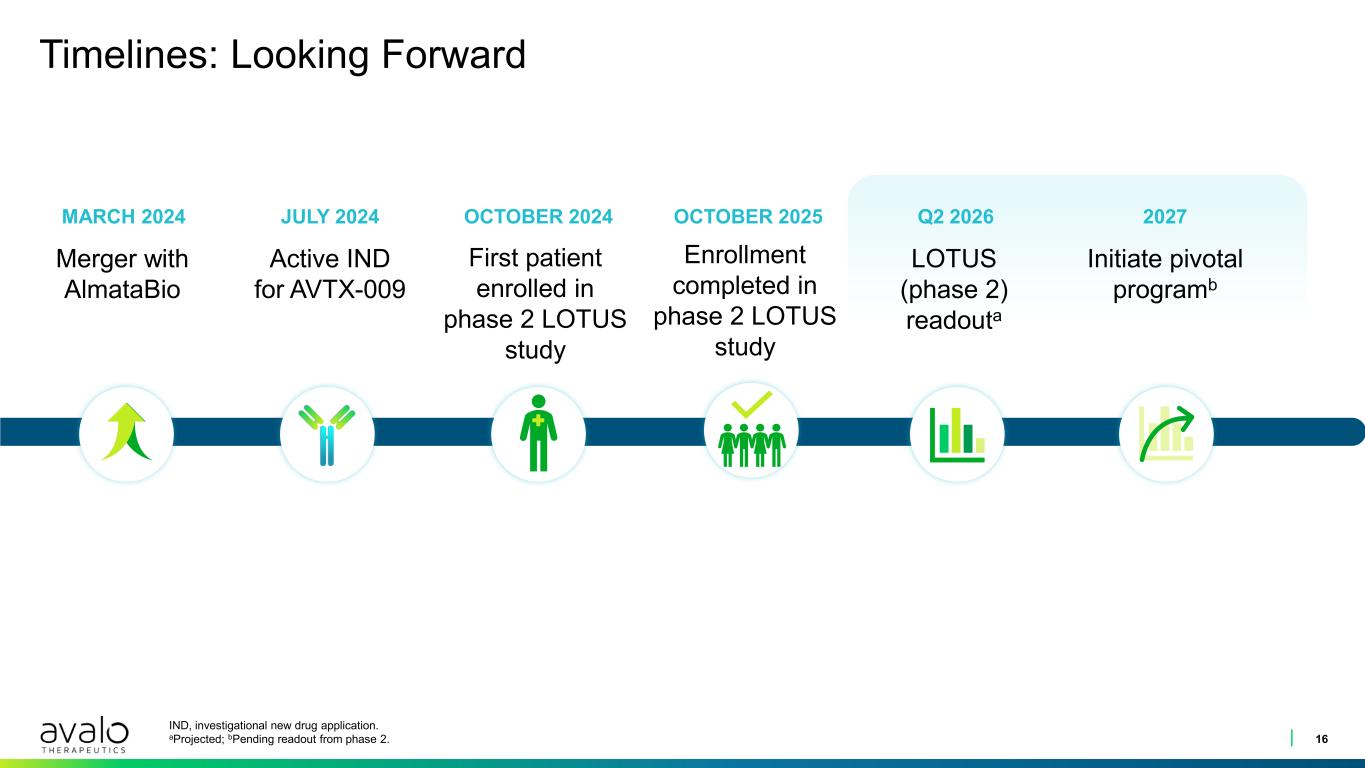 Diagnosed and Treated HS Population is Projected to Grow Substantially into a $10B+ Global Market by 20351 15 HCP, healthcare provider; HS, hidradenitis suppurativa; U.S., United States. 1. HS Market Research 2024. Avalo Therapeutics Data on File; 2. Nguyen TV, et al. J Eur Acad Dermatol Venereol. 2021;35(1):50-61; 3. Garg AX, et al. Dermatol Ther. 2022;3:581-594; 4. Ingram JR, et al. J Eur Acad Dermatol Venereol. 2022;36(9):1597-1605; 5. Rinderknecht FB, Naik HB. Int J Womens Dermatol. 2024;10(1):e130. HS affects an estimated 1–4% of the population globally; 0.5% US population CAGR 3.4 MILLION IN 2024 3.5 MILLION PROJECTED IN 2035 1.0 MILLION IN 2024 1.6 MILLION PROJECTED IN 2035 ~100 THOUSAND IN 2024 >200 THOUSAND PROJECTED IN 2035 320 THOUSAND IN 2024 >500 THOUSAND PROJECTED IN 2035 HS prevalence (U.S.)2 HS diagnosed and treated (U.S)3 Growth in the number of diagnosed and treated patients from 30% to 45% of the total population, driven by new development and visibility with HCPs and patients Moderate-to-severe HS (U.S.)4 Increased recognition of disease leads to 60% growth of identified moderate to severe HS Biologics treated (U.S.)5 New approvals will lead to more patients being treated with biologics, increasing to ~40% share of segment (evidenced by the recent quickly growing use of Cosentyx® and Bimzelx®)