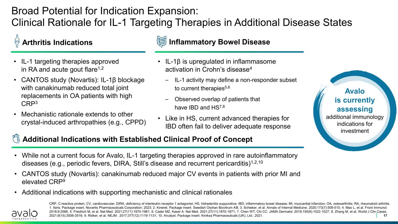 Broad Potential for Indication Expansion: Clinical Rationale for IL-1 Targeting Therapies in Additional Disease States 17 CRP, C-reactive protein; CV, cardiovascular; DIRA, deficiency of interleukin receptor 1 antagonist; HS, hidradenitis suppurativa; IBD, inflammatory bowel disease; MI, myocardial infarction; OA, osteoarthritis; RA, rheumatoid arthritis. 1. Ilaris. Package insert. Novartis Pharmaceuticals Corporation; 2023; 2. Kineret. Package insert. Swedish Orphan Biovitrum AB; 3. Schieker, et al. Annals of Internal Medicine. 2020;173(7):509-515; 4. Mao L, et al. Front Immunol. 2018;9:2566; 5. Friedrich M, et al. Nat Med. 2021;27(11):1970-1981; 6. Cader MZ, Kaser A. Nat Med. 2021;27(11):1870-1871; 7. Chen WT, Chi CC. JAMA Dermatol. 2019;155(9):1022-1027; 8. Zhang M, et al. World J Clin Cases. 2021;9(15):3506-3516; 9. Ridker, et al. NEJM . 2017;377(12):1119-1131; 10. Arcalyst. Package insert. Kiniksa Pharmaceuticals (UK), Ltd.; 2021. • IL-1β is upregulated in inflammasome activation in Crohn’s disease4 – IL-1 activity may define a non-responder subset to current therapies5,6 – Observed overlap of patients that have IBD and HS7,8 • Like in HS, current advanced therapies for IBD often fail to deliver adequate response • IL-1 targeting therapies approved in RA and acute gout flare1,2 • CANTOS study (Novartis): IL-1β blockage with canakinumab reduced total joint replacements in OA patients with high CRP3 • Mechanistic rationale extends to other crystal-induced arthropathies (e.g., CPPD) • While not a current focus for Avalo, IL-1 targeting therapies approved in rare autoinflammatory diseases (e.g., periodic fevers, DIRA, Still’s disease and recurrent pericarditis)1,2,10 • CANTOS study (Novartis): canakinumab reduced major CV events in patients with prior MI and elevated CRP9 • Additional indications with supporting mechanistic and clinical rationales Arthritis Indications Inflammatory Bowel Disease Additional Indications with Established Clinical Proof of Concept Avalo is currently assessing additional immunology indications for investment
