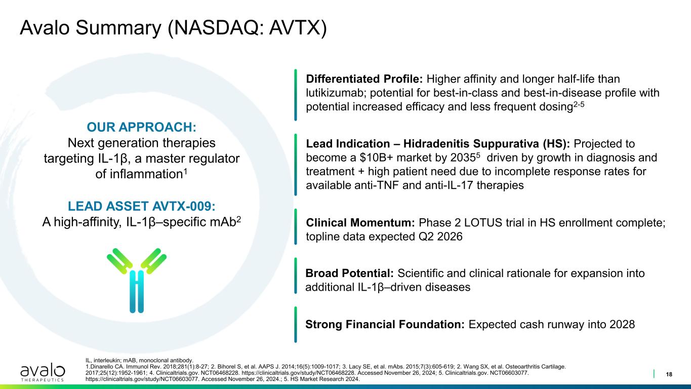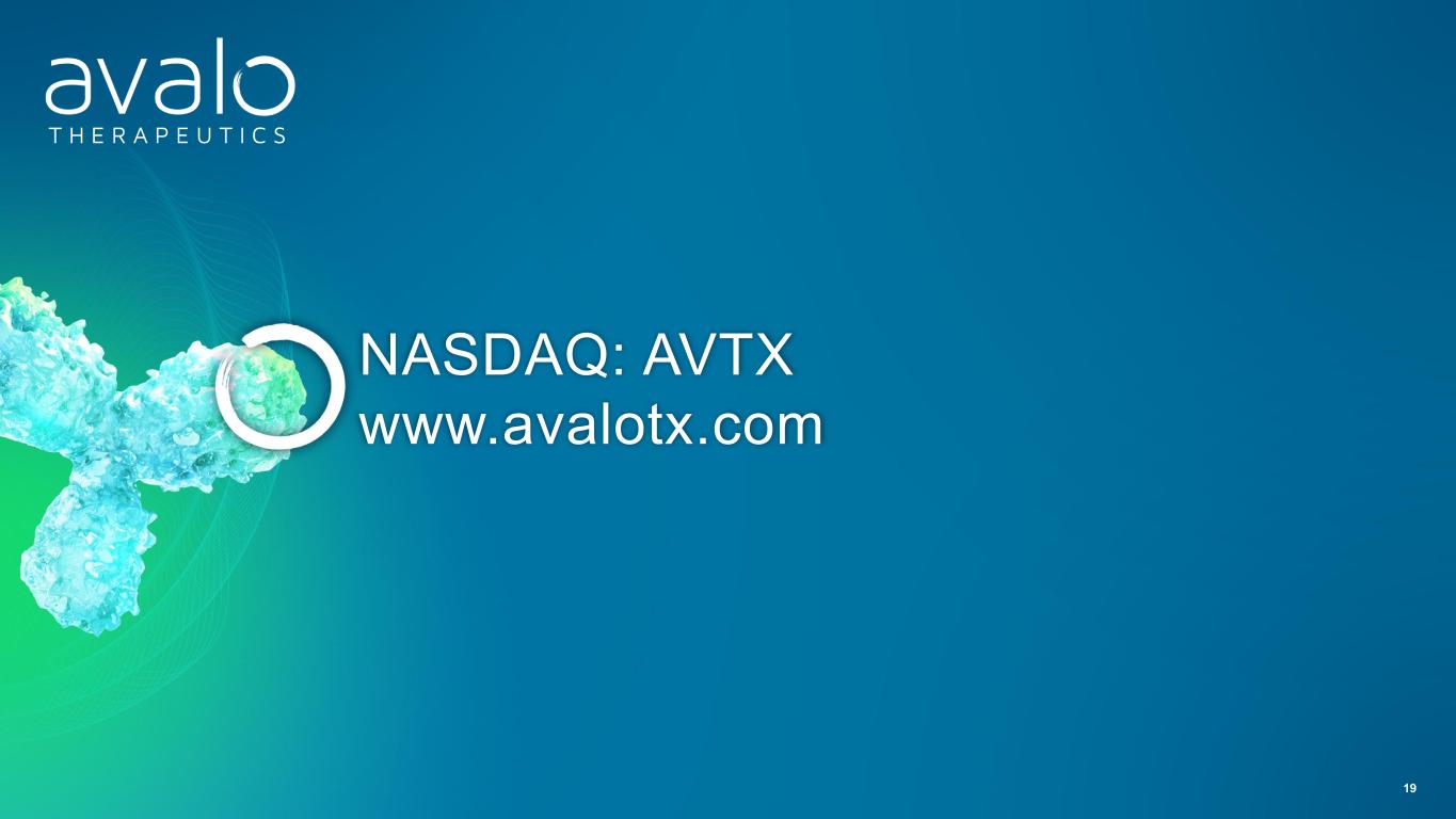 Avalo Summary (NASDAQ: AVTX) 18 IL, interleukin; mAB, monoclonal antibody. 1.Dinarello CA. Immunol Rev. 2018;281(1):8-27; 2. Bihorel S, et al. AAPS J. 2014;16(5):1009-1017; 3. Lacy SE, et al. mAbs. 2015;7(3):605-619; 2. Wang SX, et al. Osteoarthritis Cartilage. 2017;25(12):1952-1961; 4. Clinicaltrials.gov. NCT06468228. https://clinicaltrials.gov/study/NCT06468228. Accessed November 26, 2024; 5. Clinicaltrials.gov. NCT06603077. https://clinicaltrials.gov/study/NCT06603077. Accessed November 26, 2024.; 5. HS Market Research 2024. OUR APPROACH: Next generation therapies targeting IL-1β, a master regulator of inflammation1 LEAD ASSET AVTX-009: A high-affinity, IL-1β–specific mAb2 Differentiated Profile: Higher affinity and longer half-life than lutikizumab; potential for best-in-class and best-in-disease profile with potential increased efficacy and less frequent dosing2-5 Lead Indication – Hidradenitis Suppurativa (HS): Projected to become a $10B+ market by 20355 driven by growth in diagnosis and treatment + high patient need due to incomplete response rates for available anti-TNF and anti-IL-17 therapies Clinical Momentum: Phase 2 LOTUS trial in HS enrollment complete; topline data expected Q2 2026 Broad Potential: Scientific and clinical rationale for expansion into additional IL-1β–driven diseases Strong Financial Foundation: Expected cash runway into 2028