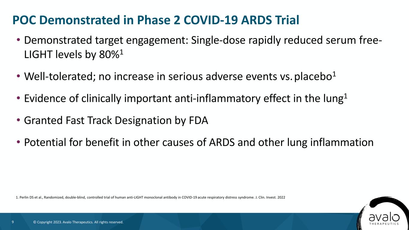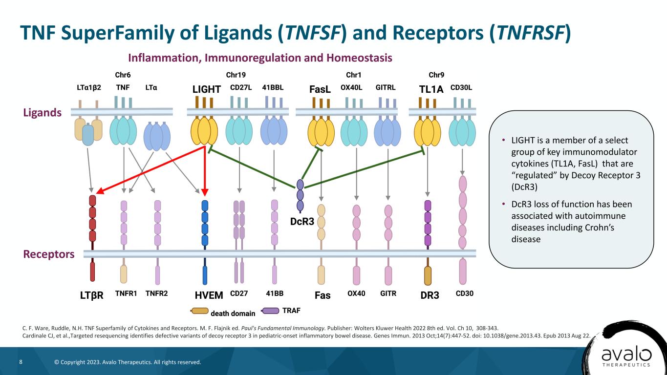 8 © Copyright 2023. Avalo Therapeutics. All rights reserved. TNF SuperFamily of Ligands (TNFSF) and Receptors (TNFRSF) C. F. Ware, Ruddle, N.H. TNF Superfamily of Cytokines and Receptors. M. F. Flajnik ed. Paul's Fundamental Immunology. Publisher: Wolters Kluwer Health 2022 8th ed. Vol. Ch 10, 308-343. Cardinale CJ, et al.,Targeted resequencing identifies defective variants of decoy receptor 3 in pediatric-onset inflammatory bowel disease. Genes Immun. 2013 Oct;14(7):447-52. doi: 10.1038/gene.2013.43. Epub 2013 Aug 22. • LIGHT is a member of a select group of key immunomodulator cytokines (TL1A, FasL) that are “regulated” by Decoy Receptor 3 (DcR3) • DcR3 loss of function has been associated with autoimmune diseases including Crohn’s disease Inflammation, Immunoregulation and Homeostasis Ligands Receptors