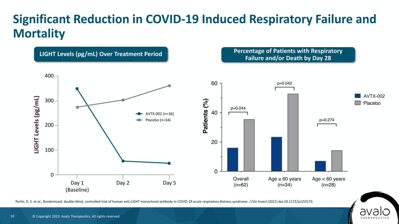9 © Copyright 2023. Avalo Therapeutics. All rights reserved. • Demonstrated target engagement: Single-dose rapidly reduced serum free- LIGHT levels by 80%1 • Well-tolerated; no increase in serious adverse events vs.placebo1 • Evidence of clinically important anti-inflammatory effect in the lung1 • Granted Fast Track Designation by FDA • Potential for benefit in other causes of ARDS and other lung inflammation 1. Perlin DS et al., Randomized, double-blind, controlled trial of human anti-LIGHT monoclonal antibody in COVID-19 acute respiratory distress syndrome. J. Clin. Invest. 2022 POC Demonstrated in Phase 2 COVID-19 ARDS Trial