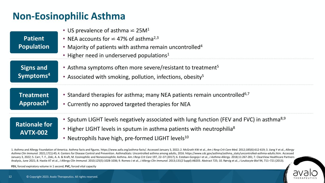 11 © Copyright 2023. Avalo Therapeutics. All rights reserved. FOR DISCUSSION PURPOSES ONLY AVTX-002 Non-Eosinophilic Asthma
