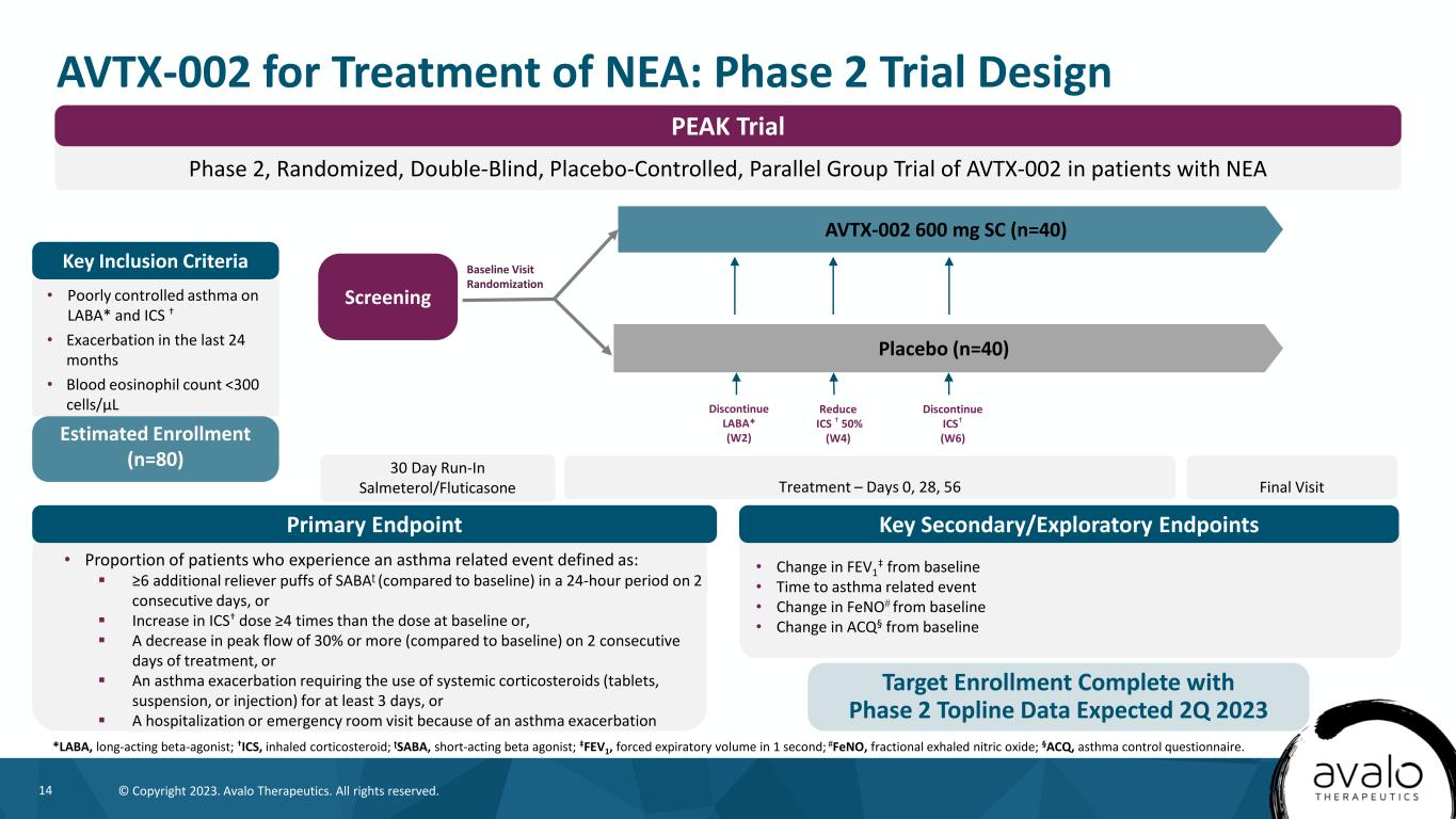 13 © Copyright 2023. Avalo Therapeutics. All rights reserved. LIGHT (TNFSF14) in Asthma and Pulmonary Fibrosis Persistent insults: antigens toxins viruses Human Patients* • LIGHT expression in lung inflammatory cells (T and NK cells), alveolar epithelial, fibroblasts, goblet cells • LIGHT expression in lungs of patients with persistent airflow limitation • IL-8, IL-19, MMP2, osteopontin associated with high LIGHT immunoreactivity • LIGHT-positive cells correlate with increased PMN, macrophages in sputum • Intense immunoreactivity of LIGHT is negatively associated with decreased forced expiratory volume Asthma Models** • Signaling receptors LTβR and HVEM expressed in lung fibroblasts, goblet and epithelial cells • Pharmacological inhibition or gene deletion of LIGHT: • Reduces Lung fibrosis, smooth muscle hyperplasia, airway hyperresponsiveness • LIGHT inhibition limits lung expression of IL13, TGFb, TSLP • LTβR controls airway smooth muscle deregulation and asthmatic lung dysfunction • LIGHT induces inflammatory activation of lung fibroblasts • LIGHT promotes differentiation of proinflammatory lung fibroblasts through LTβR Conclusion: LIGHT is a profibrogenic cytokine in asthma acting through the LTβR *Gaddis, LungMAP Portal Ecosystem: Am J Respir Cell Mol Biol doi: 10.1165/rcmb.2022-0165OC; Hirano, Respir Investig 2021 doi: 10.1016/j.resinv.2021.05.011 **Mouse models of asthma induced by antigen, bleomycin or Rhinovirus Miki J Allergy Clin Immunol 2022 DOI: 10.1016/j.jaci.2022.11.016; Mehta, Allergy 2018 DOI: 10.1111/all.13390; Da Silva Antunes Front Immunol 2018 DOI: 10.3389/fimmu.2018.00576; Herro, J Allergy Clin Immunol 2015 DOI: 10.1016/j.jaci.2014.12.1936; Doherty, Nat Med 2011 DOI: 10.1038/nm.2356 MMP2, matrix metalloproteinase-2; PMN, polymorphonuclear neutrophils