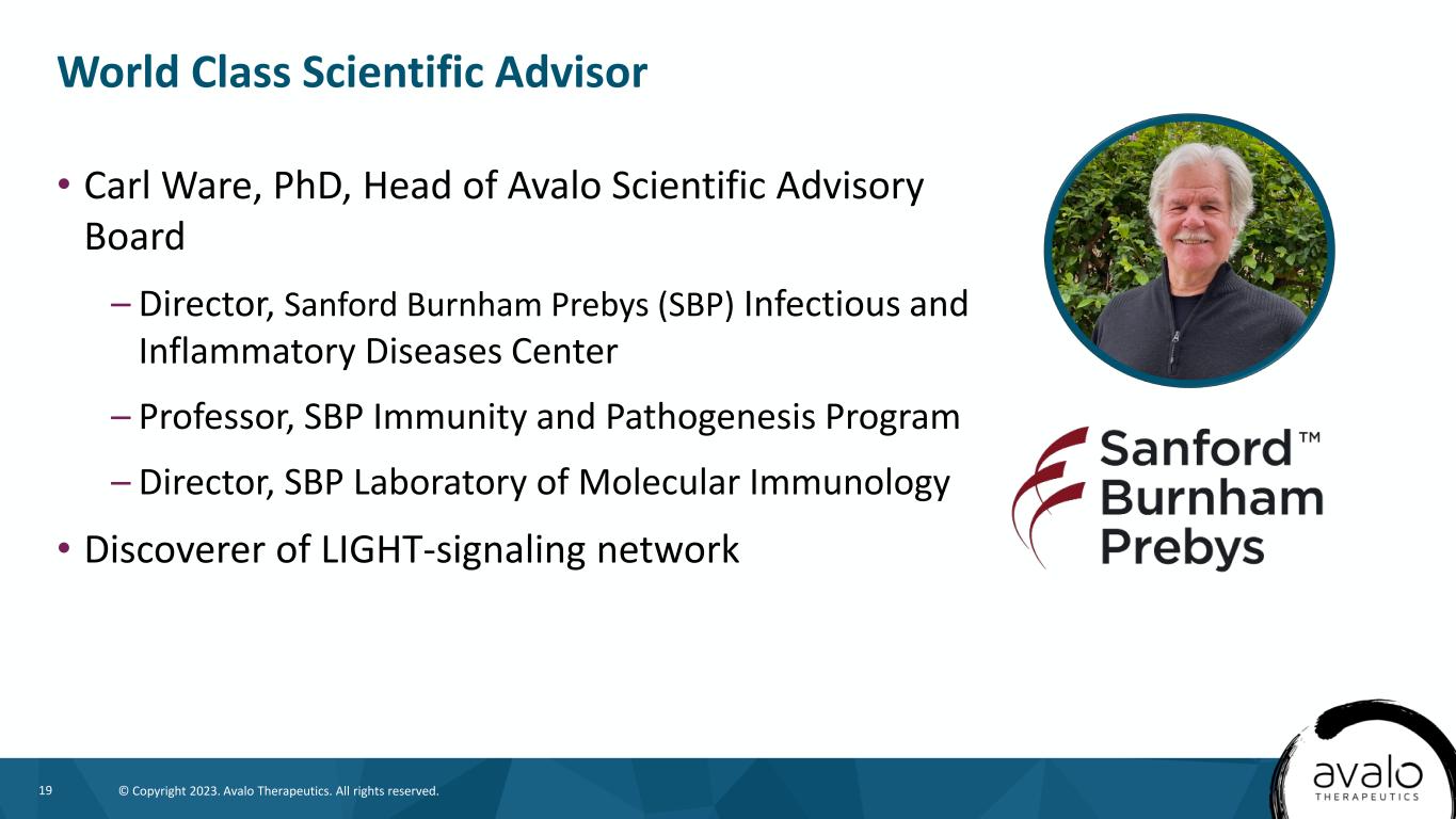 18 © Copyright 2023. Avalo Therapeutics. All rights reserved. Fully human, bioengineered HVEM, specific and high-affinity agonist for BTLA Stage • Immunoregulatory disorders: potentially SLE, GVHD and non-responders to TNF inhibitors • Inhibition of inflammatory cytokine production predicts efficacy in patients not responsive to anti-TNF therapy • Efficacy in murine lupus model excels compared to Abatacept • Reduced risk of anti-drug response • Proven modality of Fc fusion proteins: Orencia, Enbrel MOA • Novel mechanism of action • Inhibits lymphocyte activation and effector cells through BTLA • IND 2024 Executive Summary Unmet Need AVTX-008: BTLA Agonist Fusion Protein Business Advantages • Unique BTLA agonist fusion protein • Exclusive license to portfolio of issue patents and patent applications Clinical Advantages SLE, Systemic lupus erythematosus; GVHD, graft-versus-host disease