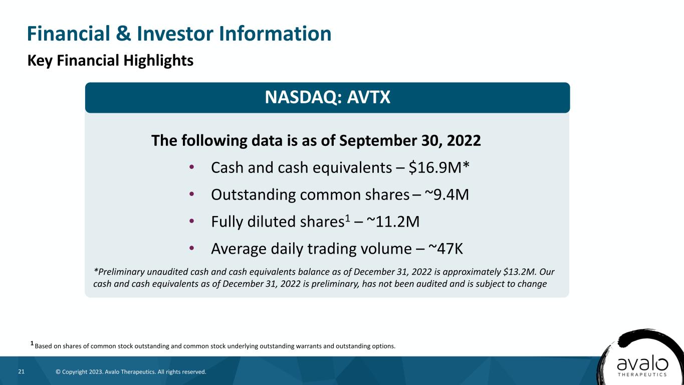 20 © Copyright 2023. Avalo Therapeutics. All rights reserved. Finance Update