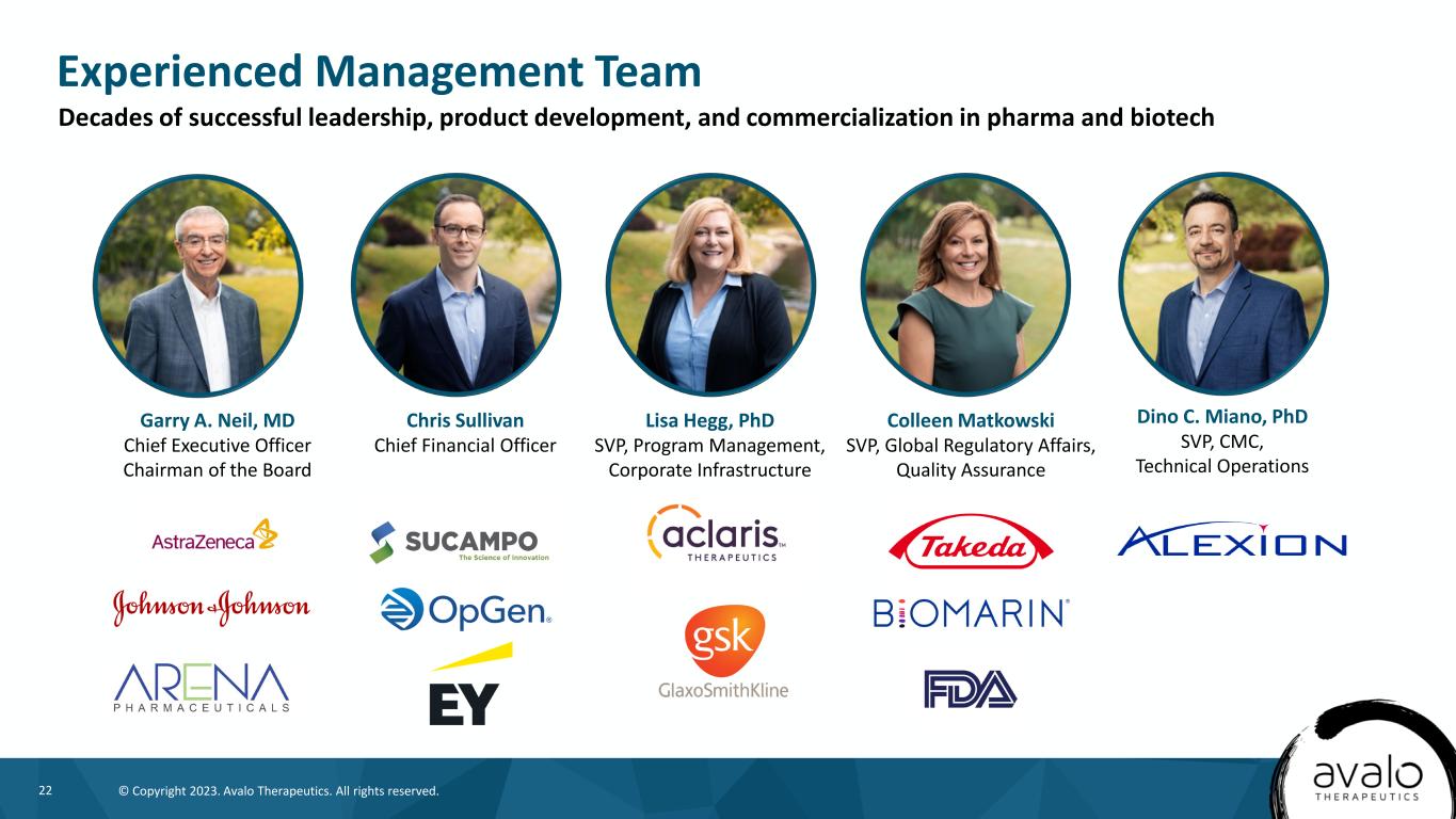 21 © Copyright 2023. Avalo Therapeutics. All rights reserved. NASDAQ: AVTX Financial & Investor Information The following data is as of September 30, 2022 • Cash and cash equivalents – $16.9M* • Outstanding common shares – ~9.4M • Fully diluted shares1 – ~11.2M • Average daily trading volume – ~47K Key Financial Highlights *Preliminary unaudited cash and cash equivalents balance as of December 31, 2022 is approximately $13.2M. Our cash and cash equivalents as of December 31, 2022 is preliminary, has not been audited and is subject to change 1 Based on shares of common stock outstanding and common stock underlying outstanding warrants and outstanding options.