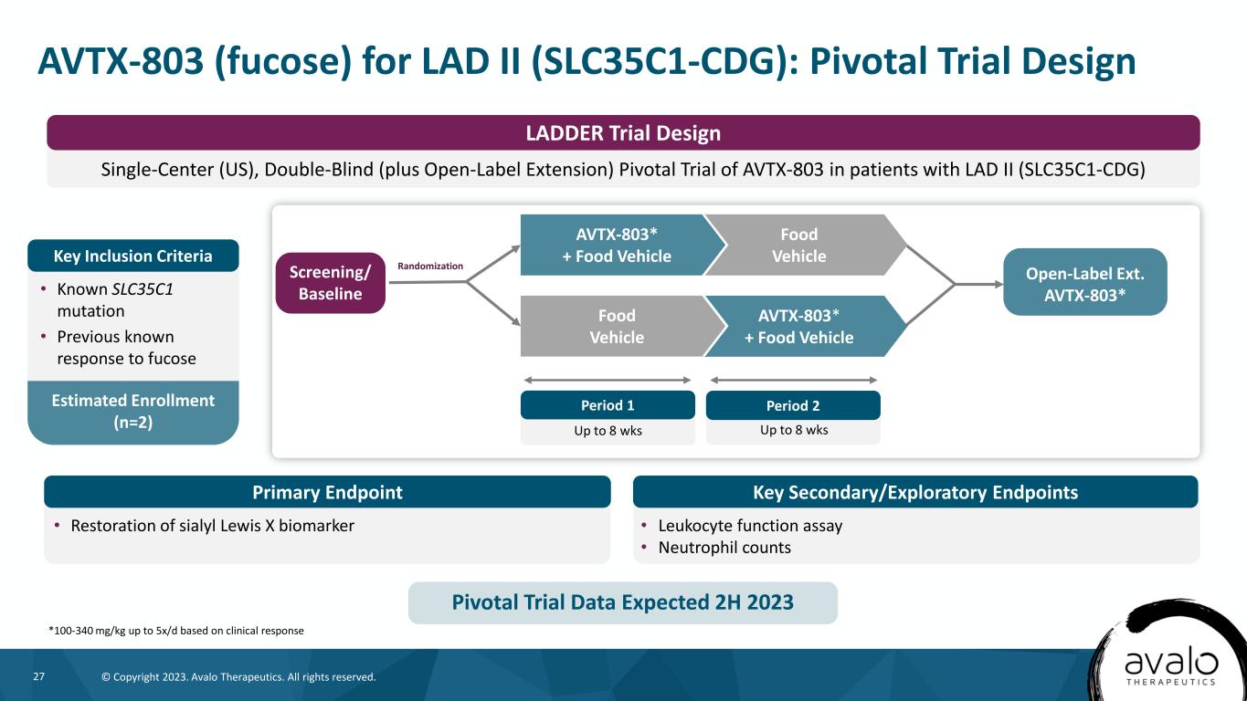 26 © Copyright 2023. Avalo Therapeutics. All rights reserved. LAD II (SLC35C1-CDG) Pathophysiology LAD Type II: Absence of sialyl Lewis X of E-selectin (SLC35C1 mutation) • Type II (LAD II) caused by LOF mutation in SLC35C1 gene resulting in the inability to fucosylate certain critical proteins • Absence of sialyl Lewis X results in neutrophil dysfunction Diagnosis/ Evaluation • Facial dysmorphism/growth & cognitive impairment • Recurrent bacterial infections due to neutrophil dysfunction Treatment • Currently no FDA-approved treatment; patients use OTC fucose • AVTX-803 granted orphan drug, Fast Track & Rare Pediatric Disease designations Patient Population • Ultra-orphan disease: worldwide prevalence ~10-20 pt • Nonfunctional GDP-fucose transporter with decreased fucosylation • Absence of sialyl Lewis X (CD15a) expression • Flow cytometry for sialyl Lewis X (CD15a) expression • Leukocytosis/neutrophil function assay • H antigen expression (for pharmacodynamic effect) Overview Signs and Symptoms AVTX-803 is an oral formulation of fucose that seeks to enhance fucosylation of proteins in the absence of a functioning GDP-fucose transporter, partially restoring protein function AVTX-803: Leukocyte Adhesion Disorders (LAD II)