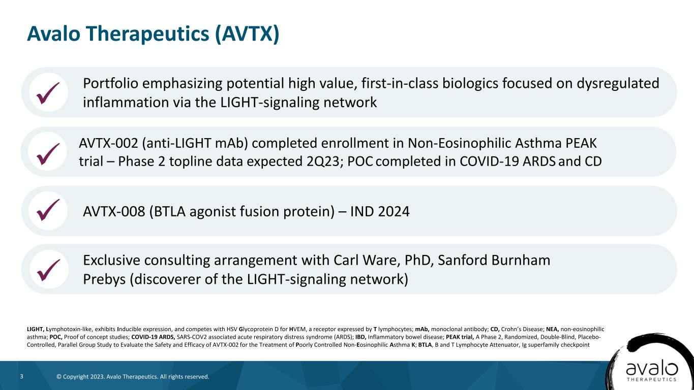 2 © Copyright 2023. Avalo Therapeutics. All rights reserved. This presentation may include forward-looking statements made pursuant to the Private Securities Litigation Reform Act of 1995. Forward-looking statements are statements that are not historical facts. Such forward-looking statements are subject to significant risks and uncertainties that are subject to change based on various factors (many of which are beyond the control of Avalo Therapeutics, Inc. (“Avalo” or the “Company”)), which could cause actual results to differ from the forward-looking statements. Such statements may include, without limitation, statements with respect to Avalo’s plans, objectives, projections, expectations and intentions and other statements identified by words such as “projects,” “may,” “might,” “will,” “could,” “would,” “should,” “continue,” “seeks,” “aims,” “predicts,” “believes,” “expects,” “anticipates,” “estimates,” “intends,” “plans,” “potential,” or similar expressions (including their use in the negative), or by discussions of future matters such as: the future financial and operational outlook of the Company; the development of product candidates or products; timing and success of trial results and regulatory review; potential attributes and benefits of product candidates; and other statements that are not historical. These statements are based upon the current beliefs and expectations of Avalo’s management but are subject to significant risks and uncertainties, including: drug development costs, timing of trial results and other risks, including reliance on investigators and enrollment of patients in clinical trials, which might be slowed by the COVID-19 pandemic; Avalo’s debt and cash position and the potential need for it to raise additional capital; reliance on key personnel; regulatory risks; general economic and market risks and uncertainties, including those caused by the COVID-19 pandemic and the war in Ukraine; and those other risks detailed in Avalo’s filings with the Securities and Exchange Commission. Actual results may differ from those set forth in the forward-looking statements. Except as required by applicable law, Avalo expressly disclaims any obligations or undertaking to release publicly any updates or revisions to any forward-looking statements contained herein to reflect any change in Avalo’s expectations with respect thereto or any change in events, conditions or circumstances on which any statement is based. Forward-Looking Statements