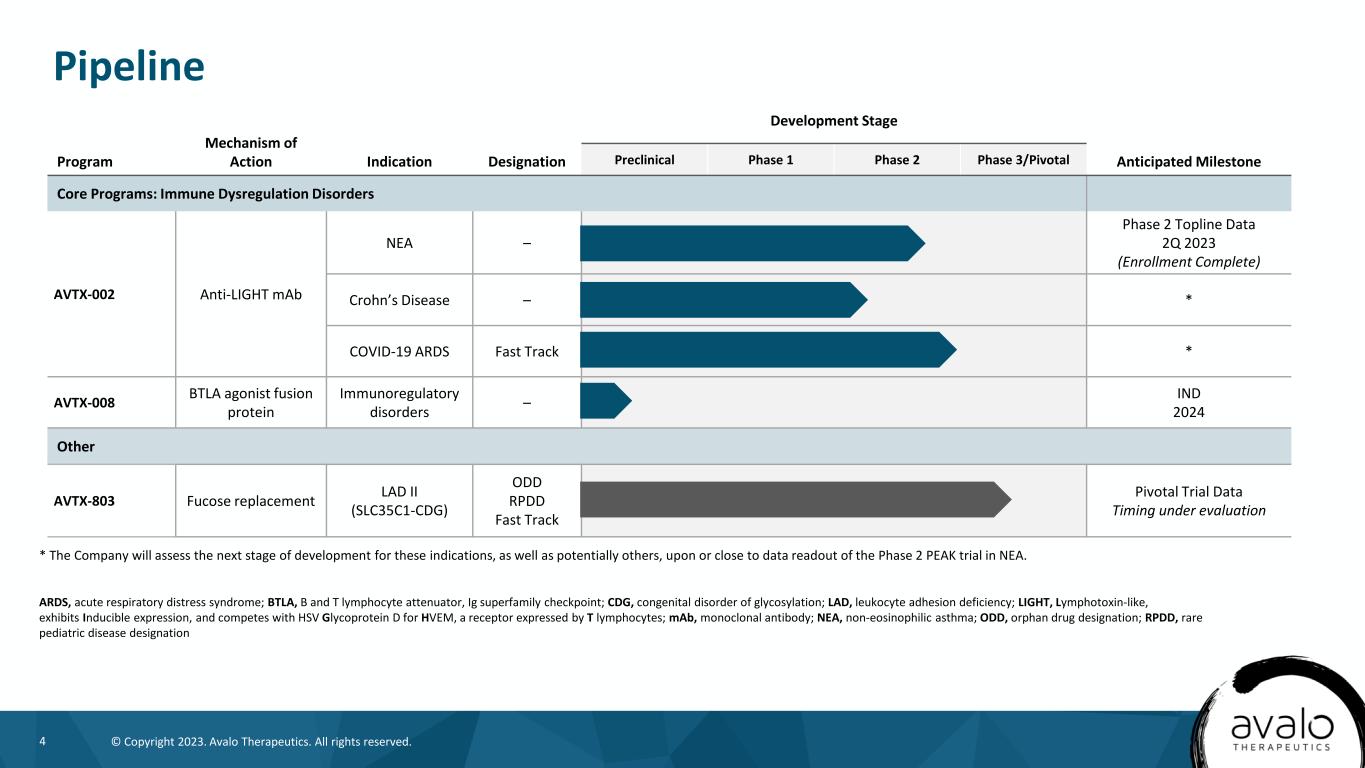 3 © Copyright 2023. Avalo Therapeutics. All rights reserved. Exclusive consulting arrangement with Carl Ware, PhD, Sanford Burnham Prebys (discoverer of the LIGHT-signaling network) LIGHT, Lymphotoxin-like, exhibits Inducible expression, and competes with HSV Glycoprotein D for HVEM, a receptor expressed by T lymphocytes; mAb, monoclonal antibody; CD, Crohn’s Disease; NEA, non-eosinophilic asthma; POC, Proof of concept studies; COVID-19 ARDS, SARS-COV2 associated acute respiratory distress syndrome (ARDS); IBD, Inflammatory bowel disease; PEAK trial, A Phase 2, Randomized, Double-Blind, Placebo- Controlled, Parallel Group Study to Evaluate the Safety and Efficacy of AVTX-002 for the Treatment of Poorly Controlled Non-Eosinophilic Asthma K; BTLA, B and T Lymphocyte Attenuator, Ig superfamily checkpoint AVTX-002 (anti-LIGHT mAb) completed enrollment in Non-Eosinophilic Asthma PEAK trial – Phase 2 topline data expected 2Q23; POC completed in COVID-19 ARDS and CD Portfolio emphasizing potential high value, first-in-class biologics focused on dysregulated inflammation via the LIGHT-signaling network AVTX-008 (BTLA agonist fusion protein) – IND 2024  Avalo Therapeutics (AVTX) 