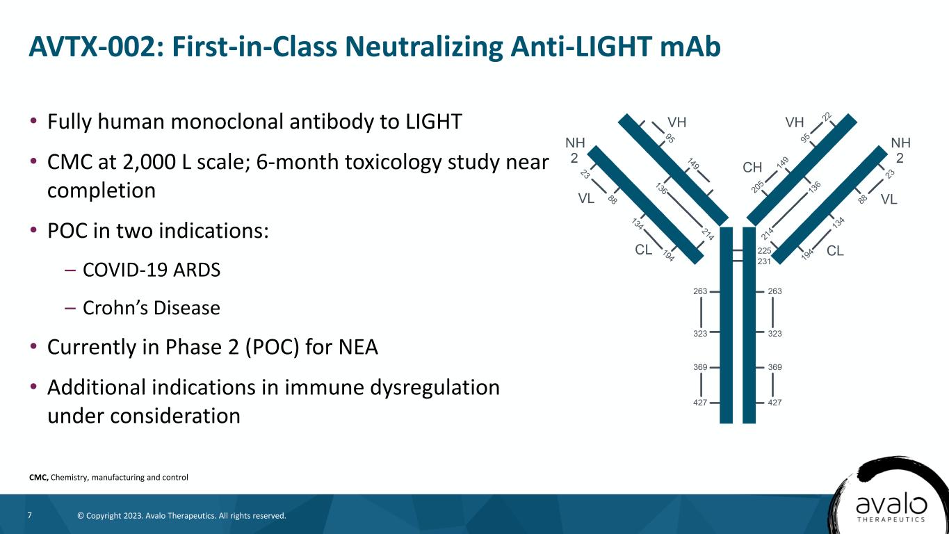 6 © Copyright 2023. Avalo Therapeutics. All rights reserved. Ware, C., Croft, M., and Neil, G. J.Exp Med. 2022 Jul 4;219(7):e20220236. 10.1084/jem.20220236. CD4Tem, CD4 effector-memory T cells; DC, dendritic cell; HVEM, herpes virus entry mediator; LTβR, Lymphotoxin beta receptor; MAC, macrophage; NK, natural killer cell; Tfh, T follicular helper cells; TNF, tumor necrosis factor LIGHT is a Key Driver of Acute & Chronic Inflammation • Proinflammatory cytokine in the TNF superfamily • Key component of a larger immunoregulatory network, including BTLA • Critical for neutrophil, NK, T & B cell function • Two primary receptors: LTβR, HVEM • Pivotal role in body “barriers”: lung, gut, skin • We believe modulating LIGHT can moderate immune dysregulation in many acute and chronic inflammatory disorders