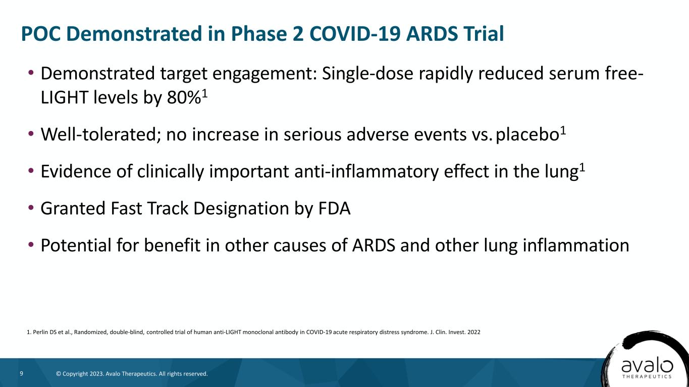 8 © Copyright 2023. Avalo Therapeutics. All rights reserved. TNF SuperFamily of Ligands (TNFSF) and Receptors (TNFRSF) C. F. Ware, Ruddle, N.H. TNF Superfamily of Cytokines and Receptors. M. F. Flajnik ed. Paul's Fundamental Immunology. Publisher: Wolters Kluwer Health 2022 8th ed. Vol. Ch 10, 308-343. Cardinale CJ, et al.,Targeted resequencing identifies defective variants of decoy receptor 3 in pediatric-onset inflammatory bowel disease. Genes Immun. 2013 Oct;14(7):447-52. doi: 10.1038/gene.2013.43. Epub 2013 Aug 22. • LIGHT is a member of a select group of key immunomodulator cytokines (TL1A, FasL) that are “regulated” by Decoy Receptor 3 (DcR3) • DcR3 loss of function has been associated with autoimmune diseases including Crohn’s disease Inflammation, Immunoregulation and Homeostasis Ligands Receptors