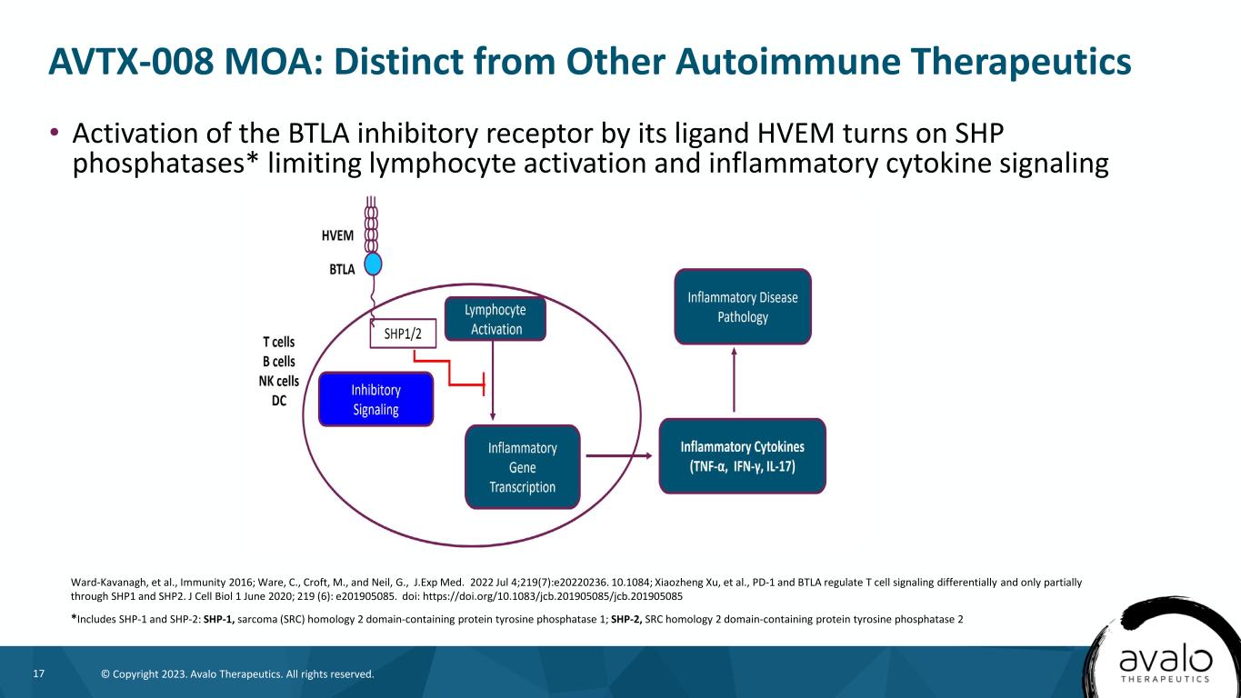 16 © Copyright 2023. Avalo Therapeutics. All rights reserved. • BTLA - B and T lymphocyte attenuator (Ig superfamily checkpoint) – Co-expressed with HVEM in T and B cells – “Dampens” the immune response • LIGHT activates HVEM – Inhibits BTLA signaling, allowing immune stimulation • LIGHT activates LTβR – Activates dendritic cells, macrophages, stromal cells – Recruits lymphocytes – Stimulates antigen presentation & lymphoid organization • DcR3 inhibits/regulates LIGHT • CD160 competes with BTLA for HVEM – Stimulated immune activation by restricting inhibitory signaling in NK, CTL, Tfh • BTLA and CD160 can activate HVEM (bidirectional signaling) Arrow heads refer to mono and bidirectional signaling Ward-Kavanagh et al., Immunity 2016. Šedý et al., Cold Spring Harb Perspect Biol 2014; Mintz & Cyster Immunol Rev 2020; Ware, C., Croft, M., and Neil, G. J.Exp Med. 2022 Jul 4;219(7):e20220236. 10.1084. DcR3, decoy receptor 3 The LIGHT-Signaling Network: A Key Immunoregulatory System