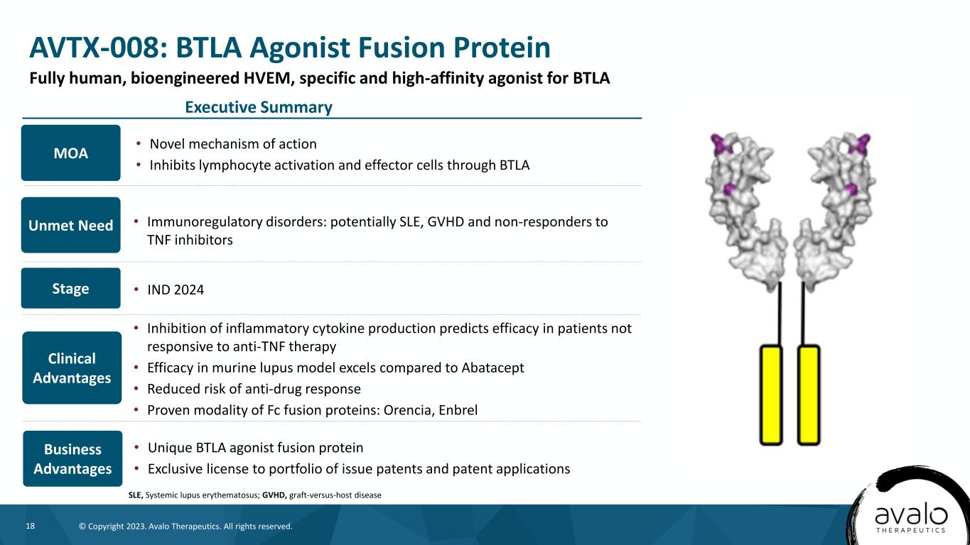 17 © Copyright 2023. Avalo Therapeutics. All rights reserved. • Activation of the BTLA inhibitory receptor by its ligand HVEM turns on SHP phosphatases* limiting lymphocyte activation and inflammatory cytokine signaling AVTX-008 MOA: Distinct from Other Autoimmune Therapeutics Ward-Kavanagh, et al., Immunity 2016; Ware, C., Croft, M., and Neil, G., J.Exp Med. 2022 Jul 4;219(7):e20220236. 10.1084; Xiaozheng Xu, et al., PD-1 and BTLA regulate T cell signaling differentially and only partially through SHP1 and SHP2. J Cell Biol 1 June 2020; 219 (6): e201905085. doi: https://doi.org/10.1083/jcb.201905085/jcb.201905085 *Includes SHP-1 and SHP-2: SHP-1, sarcoma (SRC) homology 2 domain-containing protein tyrosine phosphatase 1; SHP-2, SRC homology 2 domain-containing protein tyrosine phosphatase 2