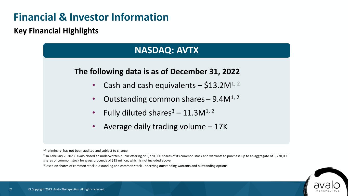 20 © Copyright 2023. Avalo Therapeutics. All rights reserved. Finance Update