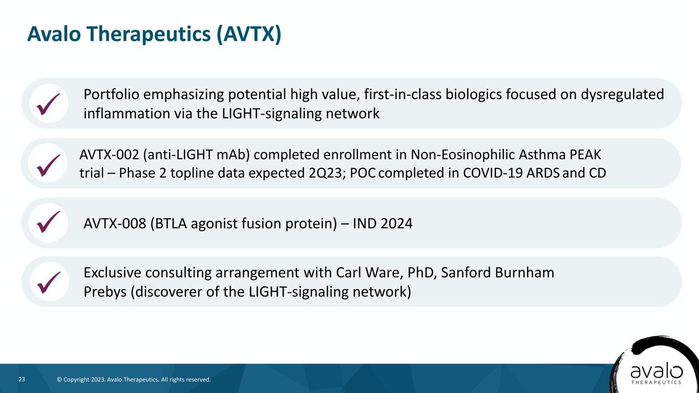 22 © Copyright 2023. Avalo Therapeutics. All rights reserved. Decades of successful leadership, product development, and commercialization in pharma and biotech Garry A. Neil, MD Chief Executive Officer Chairman of the Board Lisa Hegg, PhD SVP, Program Management, Corporate Infrastructure Colleen Matkowski SVP, Global Regulatory Affairs, Quality Assurance Dino C. Miano, PhD SVP, CMC, Technical Operations Chris Sullivan Chief Financial Officer Experienced Management Team