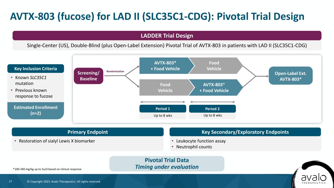 26 © Copyright 2023. Avalo Therapeutics. All rights reserved. LAD II (SLC35C1-CDG) Pathophysiology LAD Type II: Absence of sialyl Lewis X of E-selectin (SLC35C1 mutation) • Type II (LAD II) caused by LOF mutation in SLC35C1 gene resulting in the inability to fucosylate certain critical proteins • Absence of sialyl Lewis X results in neutrophil dysfunction Diagnosis/ Evaluation • Facial dysmorphism/growth & cognitive impairment • Recurrent bacterial infections due to neutrophil dysfunction Treatment • Currently no FDA-approved treatment; patients use OTC fucose • AVTX-803 granted orphan drug, Fast Track & Rare Pediatric Disease designations Patient Population • Ultra-orphan disease: worldwide prevalence ~10-20 pt • Nonfunctional GDP-fucose transporter with decreased fucosylation • Absence of sialyl Lewis X (CD15a) expression • Flow cytometry for sialyl Lewis X (CD15a) expression • Leukocytosis/neutrophil function assay • H antigen expression (for pharmacodynamic effect) Overview Signs and Symptoms AVTX-803 is an oral formulation of fucose that seeks to enhance fucosylation of proteins in the absence of a functioning GDP-fucose transporter, partially restoring protein function AVTX-803: Leukocyte Adhesion Disorders (LAD II)