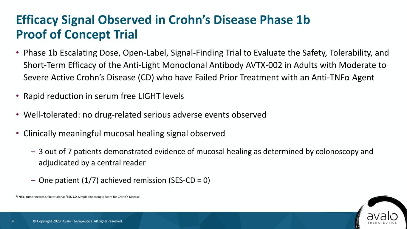 30 © Copyright 2023. Avalo Therapeutics. All rights reserved. AVTX-002 Crohn’s Disease Phase 1b Proof of Concept Trial