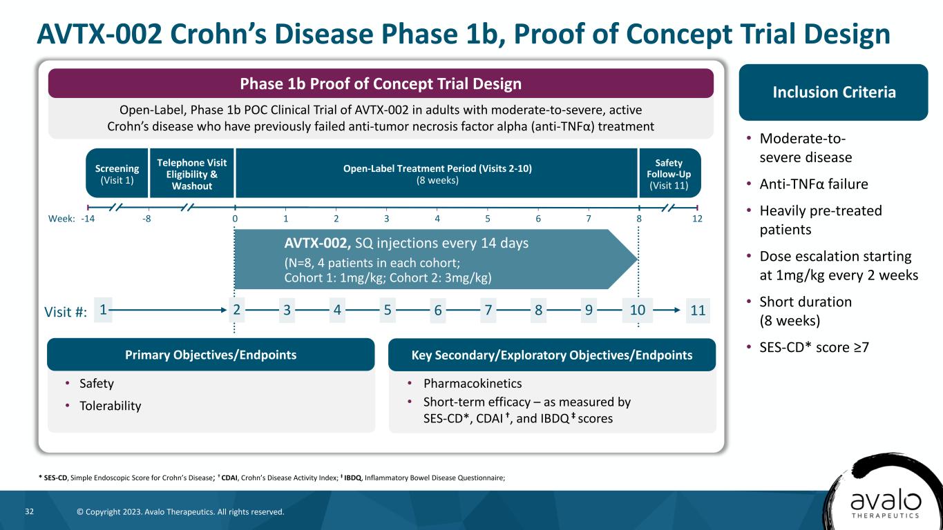 31 © Copyright 2023. Avalo Therapeutics. All rights reserved. • Phase 1b Escalating Dose, Open-Label, Signal-Finding Trial to Evaluate the Safety, Tolerability, and Short-Term Efficacy of the Anti-Light Monoclonal Antibody AVTX-002 in Adults with Moderate to Severe Active Crohn’s Disease (CD) who have Failed Prior Treatment with an Anti-TNFα Agent • Rapid reduction in serum free LIGHT levels • Well-tolerated: no drug-related serious adverse events observed • Clinically meaningful mucosal healing signal observed – 3 out of 7 patients demonstrated evidence of mucosal healing as determined by colonoscopy and adjudicated by a central reader – One patient (1/7) achieved remission (SES-CD = 0) Efficacy Signal Observed in Crohn’s Disease Phase 1b Proof of Concept Trial 1TNFα, tumor necrosis factor alpha; †SES-CD, Simple Endoscopic Score for Crohn’s Disease