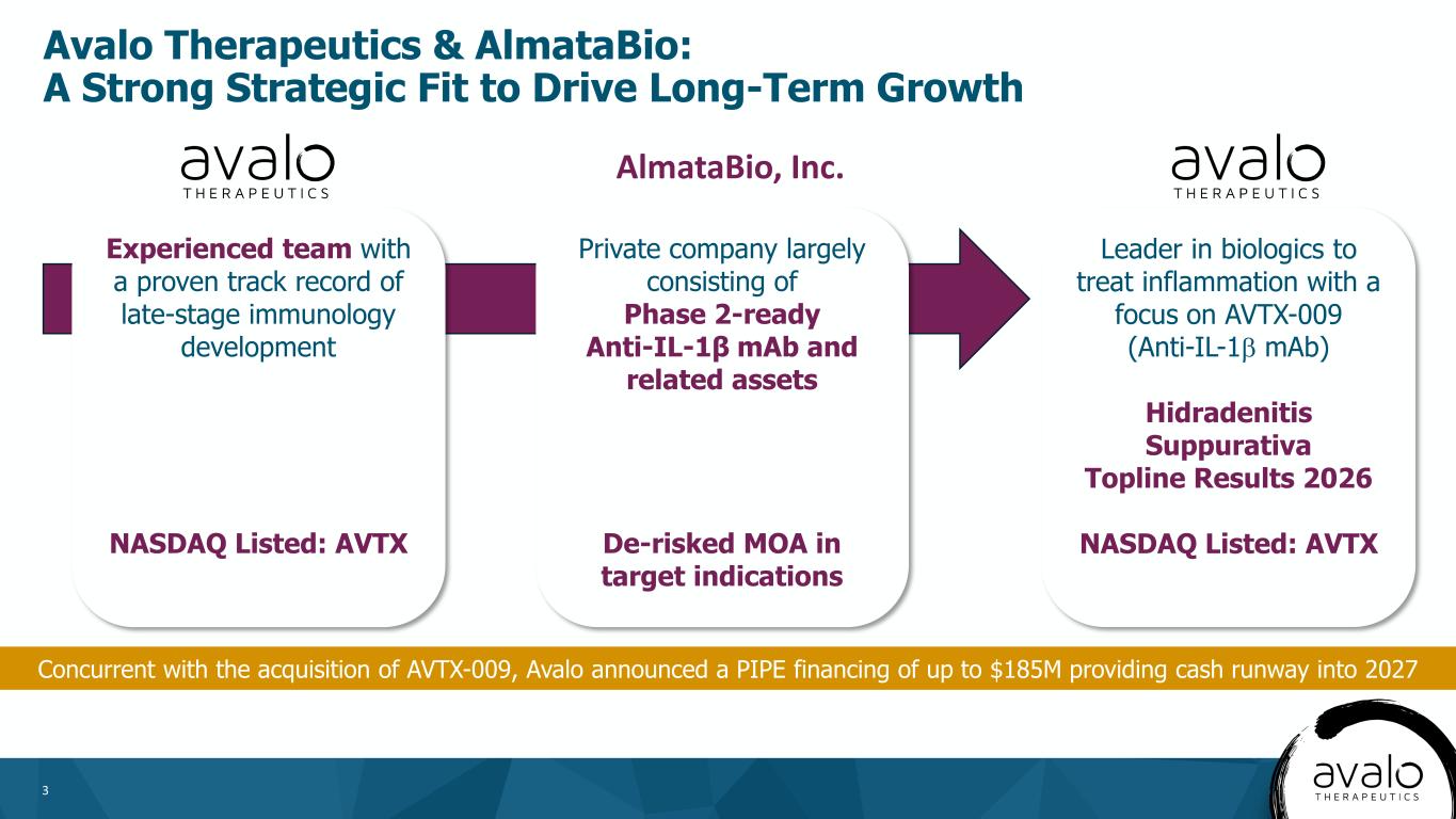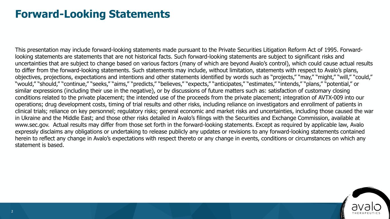 2 This presentation may include forward-looking statements made pursuant to the Private Securities Litigation Reform Act of 1995. Forward- looking statements are statements that are not historical facts. Such forward-looking statements are subject to significant risks and uncertainties that are subject to change based on various factors (many of which are beyond Avalo’s control), which could cause actual results to differ from the forward-looking statements. Such statements may include, without limitation, statements with respect to Avalo’s plans, objectives, projections, expectations and intentions and other statements identified by words such as “projects,” “may,” “might,” “will,” “could,” “would,” “should,” “continue,” “seeks,” “aims,” “predicts,” “believes,” “expects,” “anticipates,” “estimates,” “intends,” “plans,” “potential,” or similar expressions (including their use in the negative), or by discussions of future matters such as: satisfaction of customary closing conditions related to the private placement; the intended use of the proceeds from the private placement; integration of AVTX-009 into our operations; drug development costs, timing of trial results and other risks, including reliance on investigators and enrollment of patients in clinical trials; reliance on key personnel; regulatory risks; general economic and market risks and uncertainties, including those caused the war in Ukraine and the Middle East; and those other risks detailed in Avalo’s filings with the Securities and Exchange Commission, available at www.sec.gov. Actual results may differ from those set forth in the forward-looking statements. Except as required by applicable law, Avalo expressly disclaims any obligations or undertaking to release publicly any updates or revisions to any forward-looking statements contained herein to reflect any change in Avalo’s expectations with respect thereto or any change in events, conditions or circumstances on which any statement is based. Forward-Looking Statements